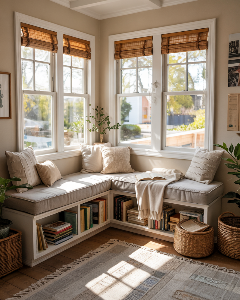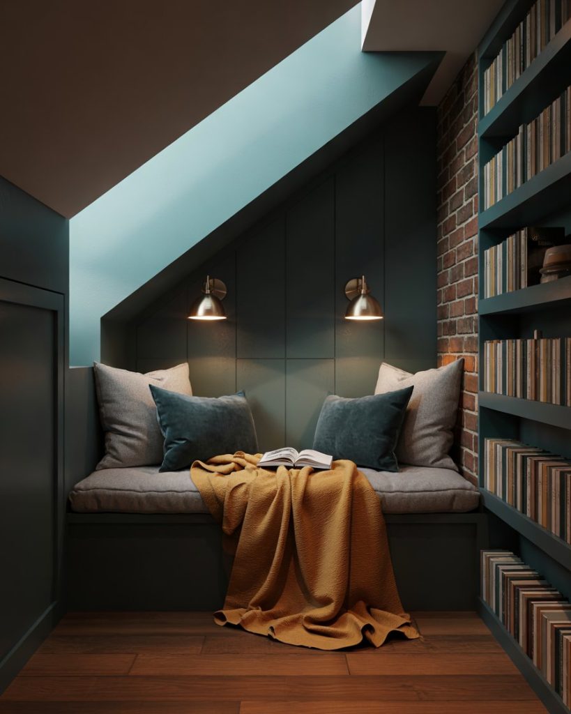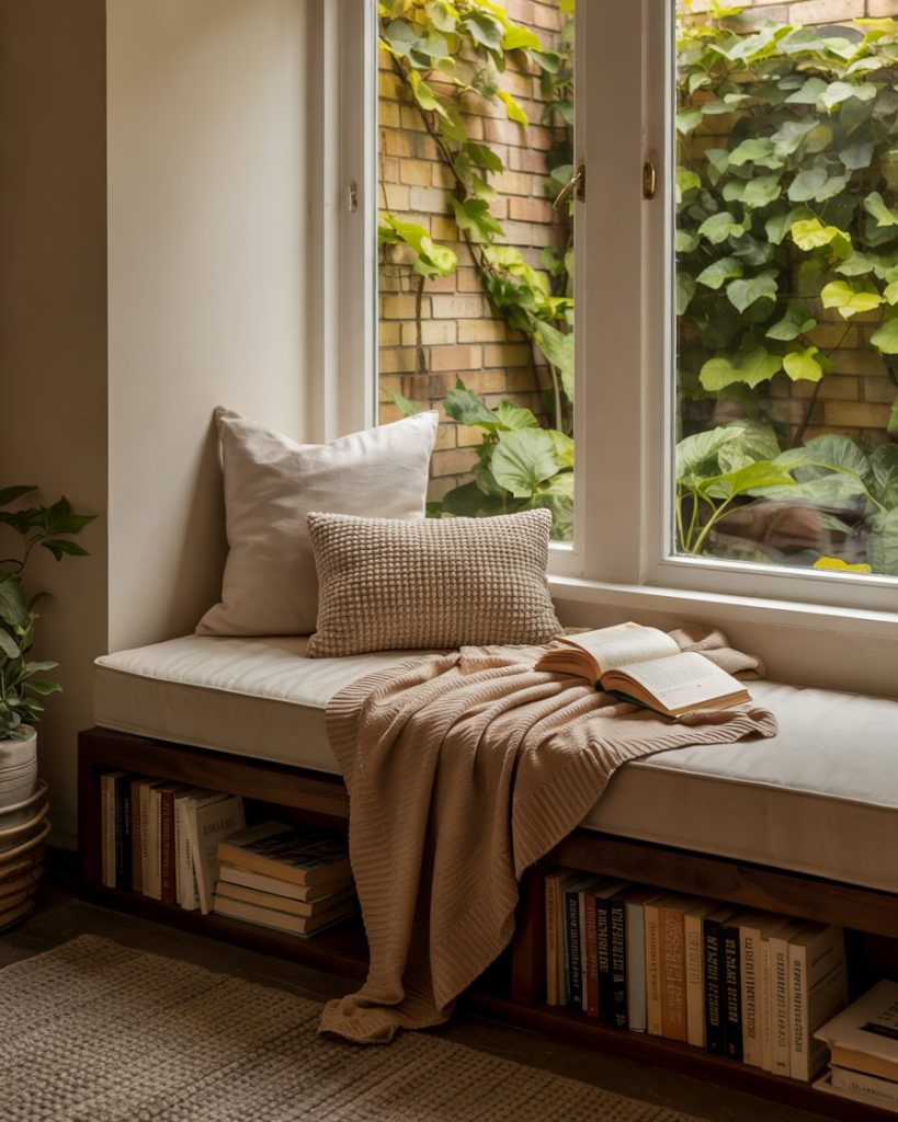 A classic cozy corner by the window never goes out of style. Add cushions, layered throws, and a built-in bench or deep chair to create a warm pocket of calm. Works in small bedroom spaces or larger living room layouts. Natural light helps you stay alert while reading, and a small shelf underneath keeps favorite titles close.