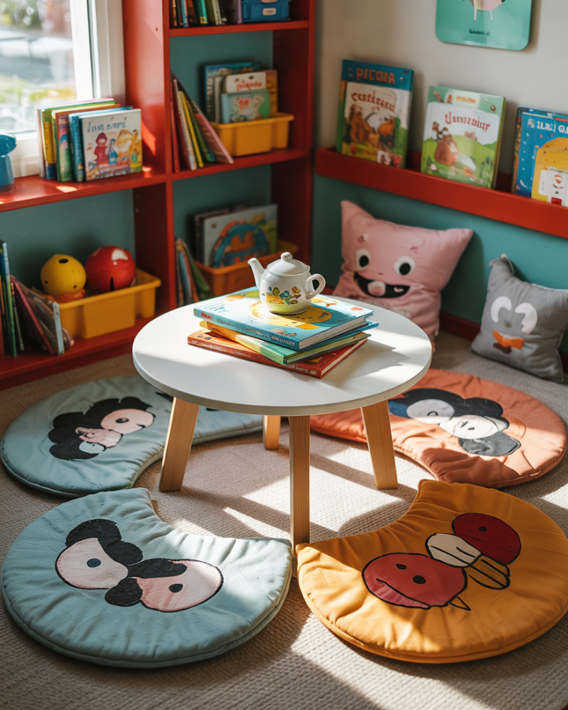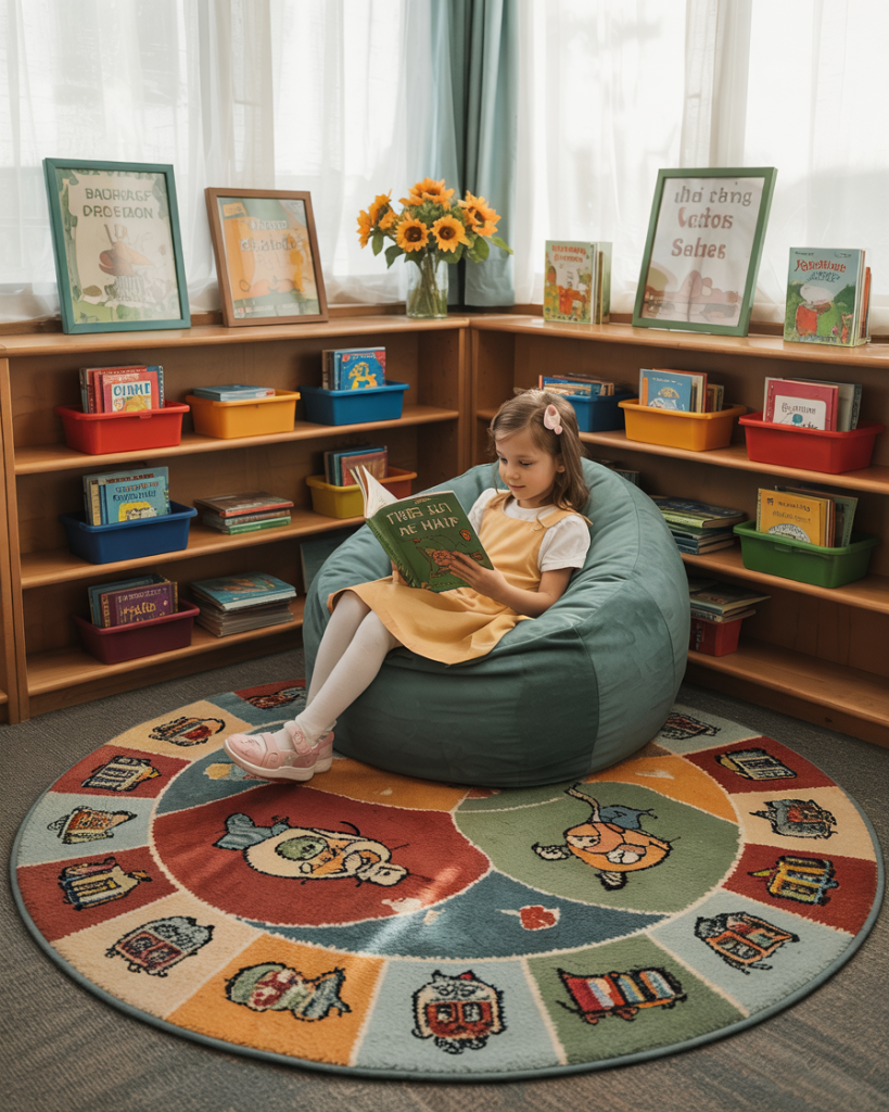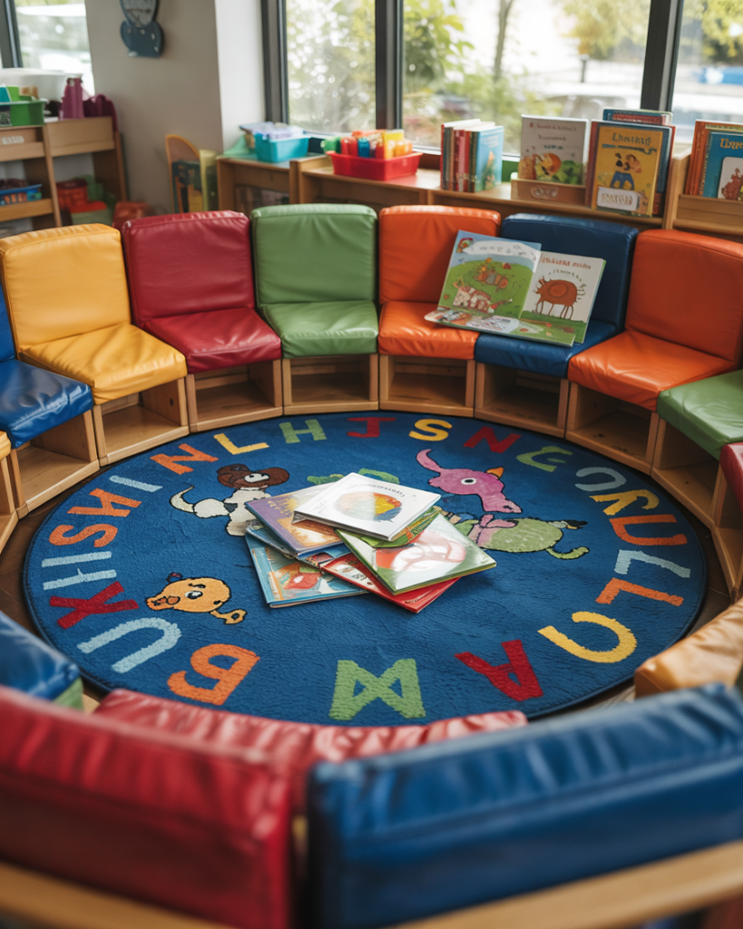 For preschool and early school rooms, soft foam seating in a circle layout makes read-aloud time social. Add alphabet rugs, tactile books, and low mirrors to reinforce phonics. This setup encourages kids to interact, listen, and point to words together.