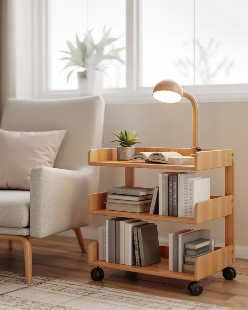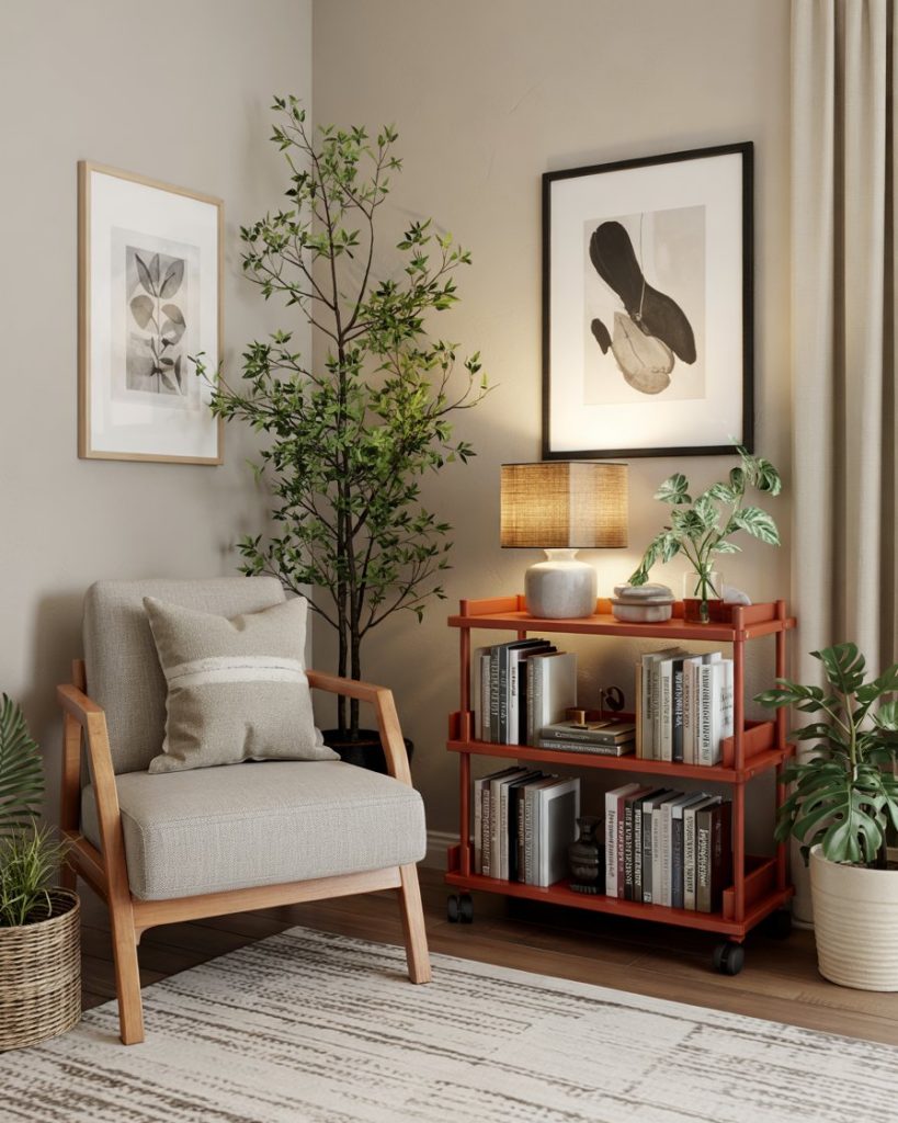 A rolling cart turns any corner into a flexible reading spot, perfect for renters or people who like to rearrange their home often. Stock it with your favorite book stack, a clip-on lamp, and a small plant. When guests arrive, just wheel it away. Works in bedrooms, living rooms, or studio spaces where every inch matters.