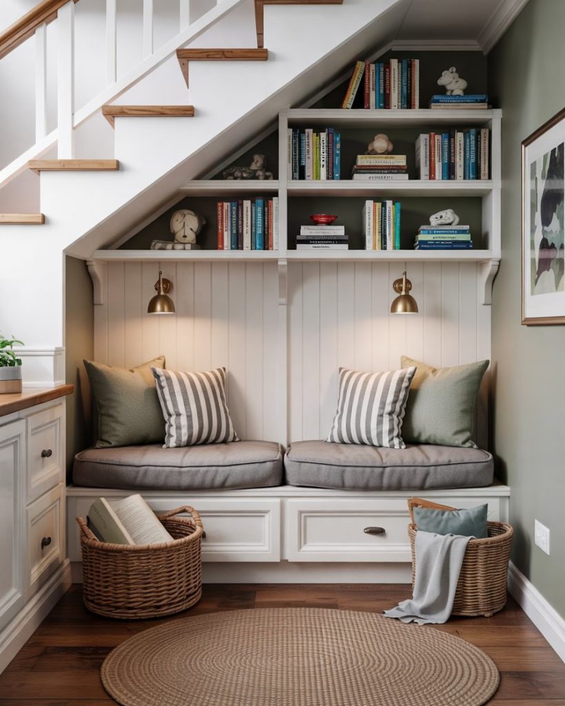 Unused stair alcoves can become magical hideouts. Add a built-in bench, sconce light, and soft throws to craft a secret cozy retreat. Designers love this because it adds function without expanding square footage. Ideal for families who want a quiet spot without blocking the living room flow.