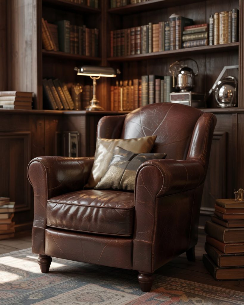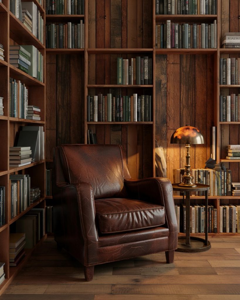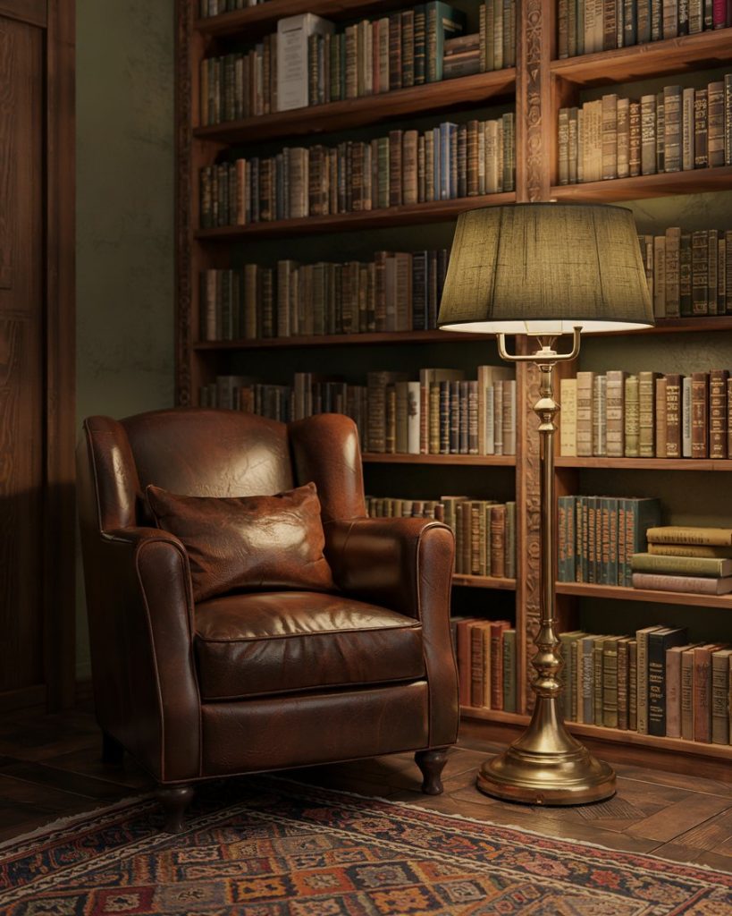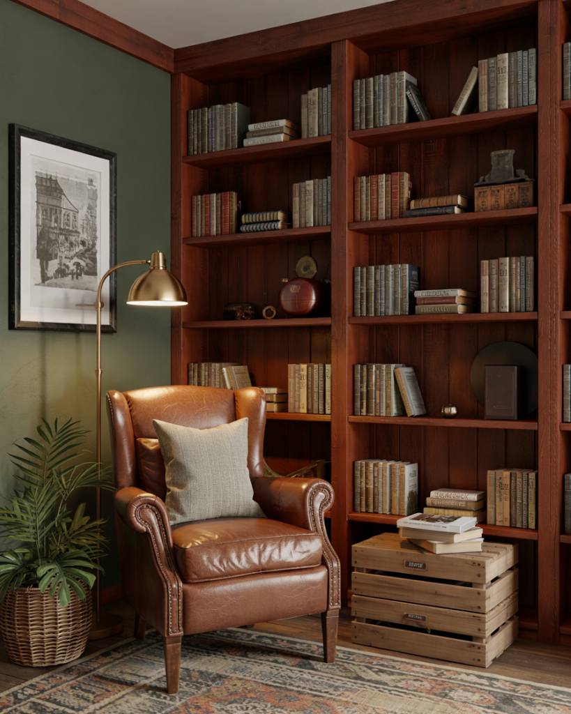 For lovers of dark wood, brass lamps, and the old-paper smell, a vintage corner feels like stepping into another era. Leather chairs, framed art, and stacked crates make it feel collected, not staged. Perfect for nostalgic readers or classic literature fans who want cozy comfort with history.