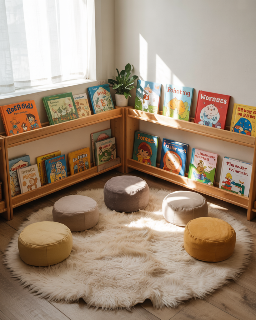 Soft mats and tiny poufs encourage children to sit, flip, and explore. This design layout follows Montessori principles by letting the child choose, touch, and freely take and return the books.
