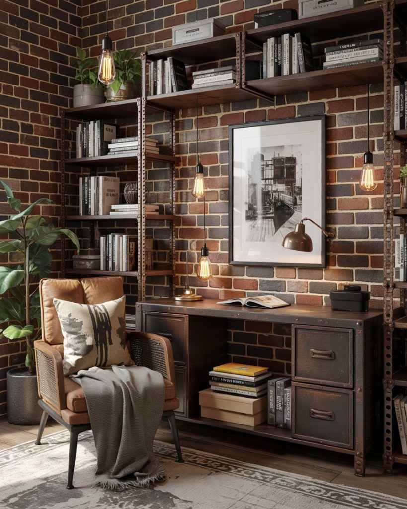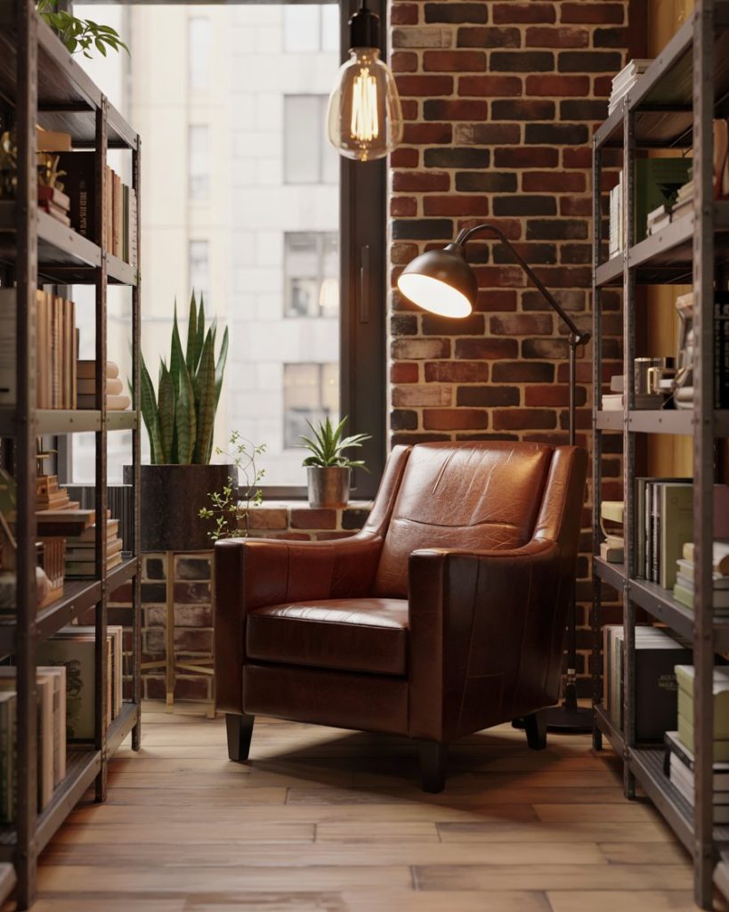 Exposed brick along with metal shelves and a rugged accent chair transforms a loft space into a bold reading zone. Incorporate Edison bulbs and rough textiles to contrast polished floors, and the look works well for city apartments with an industrial aesthetic already present.