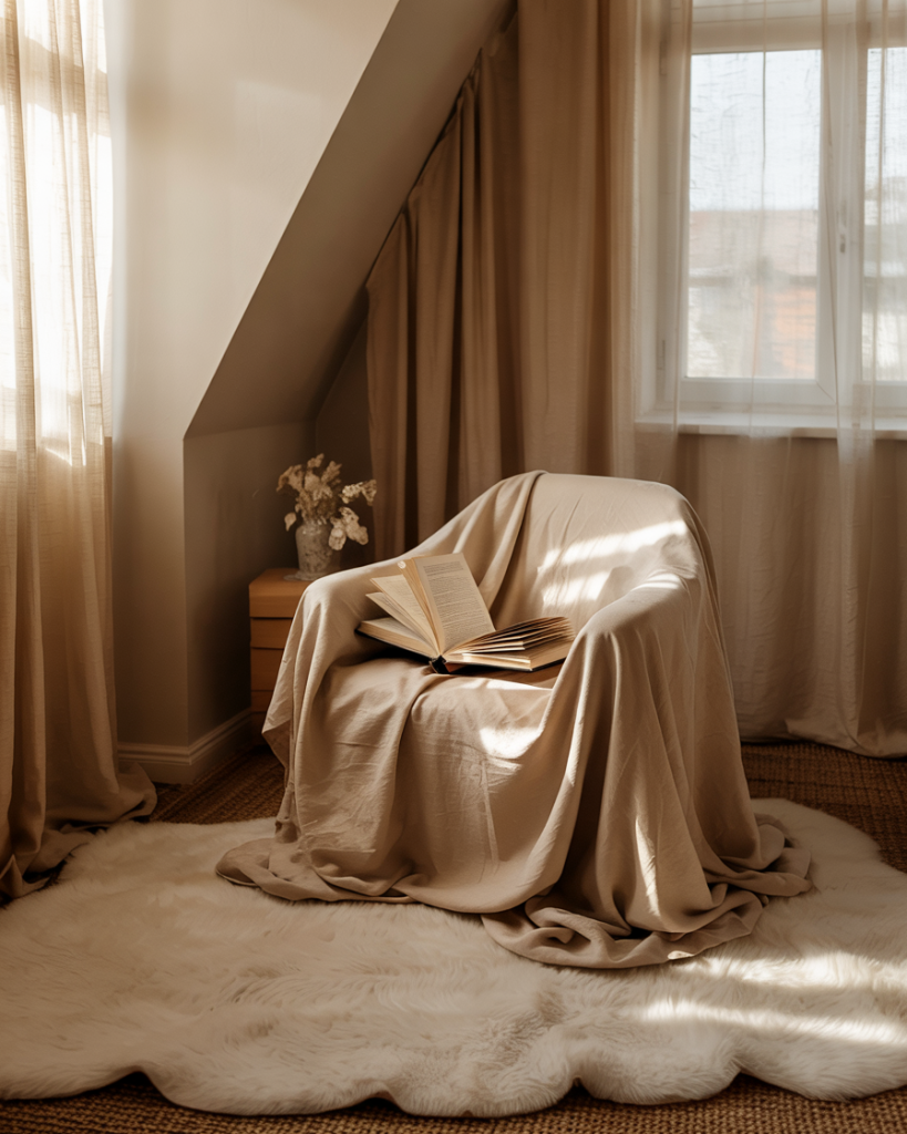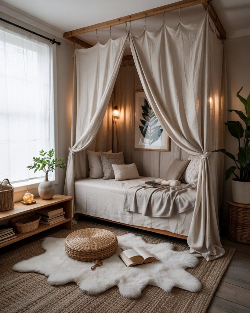 A light sheer curtain hung from the ceiling can partition a micro reading zone in a studio or shared space. Add layered neutrals, soft lighting, and a plush rug for an instant cozy escape. Ideal when you want privacy without installing real walls.