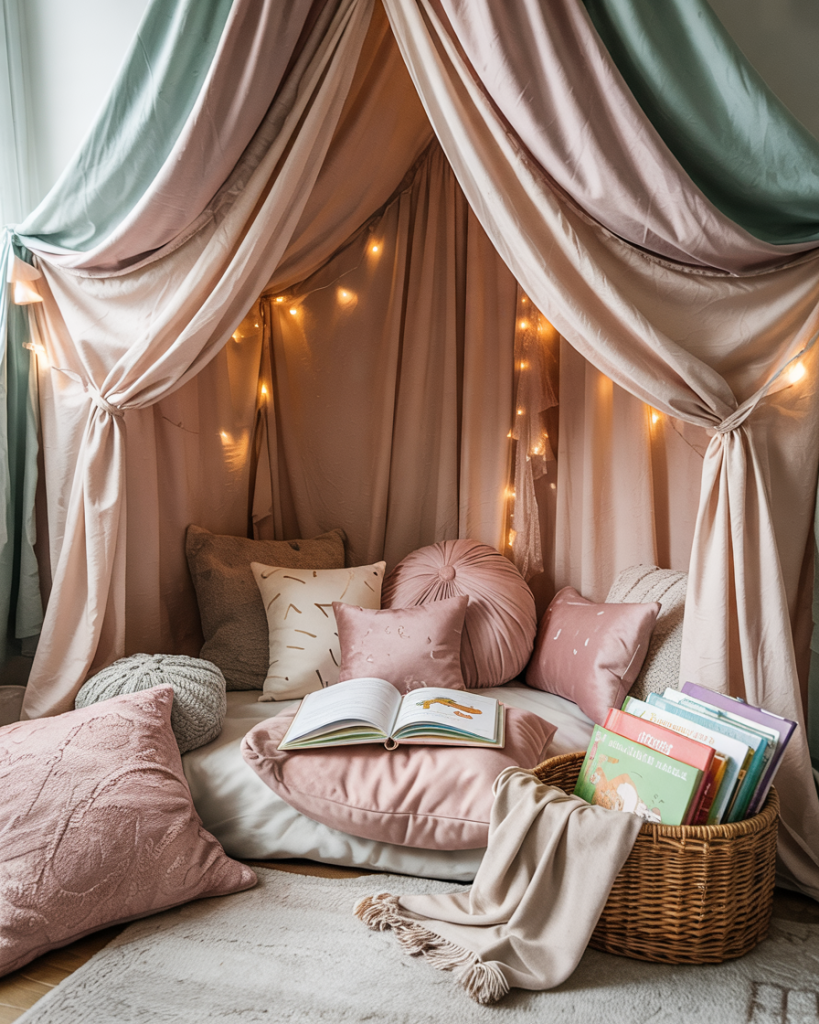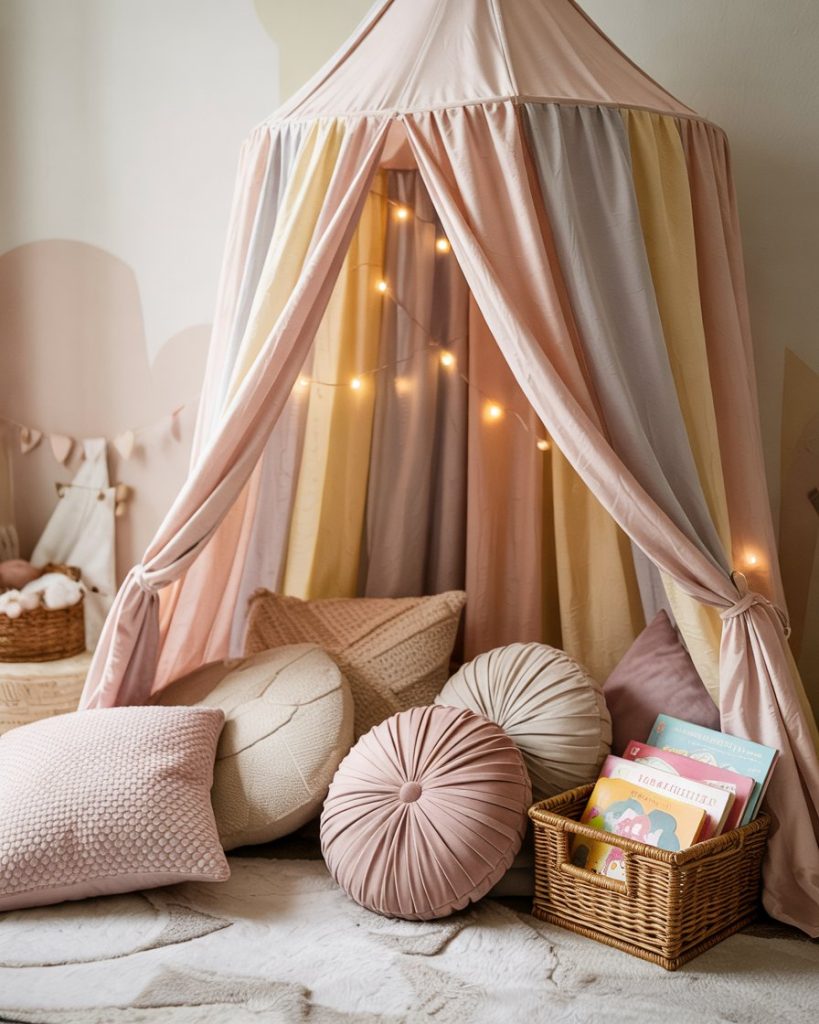 A dreamy idea for a kid’s bedroom, nursery, or playful home space. A light fabric canopy instantly builds a cozy tent-like zone, perfect for story time. Add floor cushions, fairy lights, and a low basket of books. Parents love it because it doubles as décor and a quiet retreat away from screens.