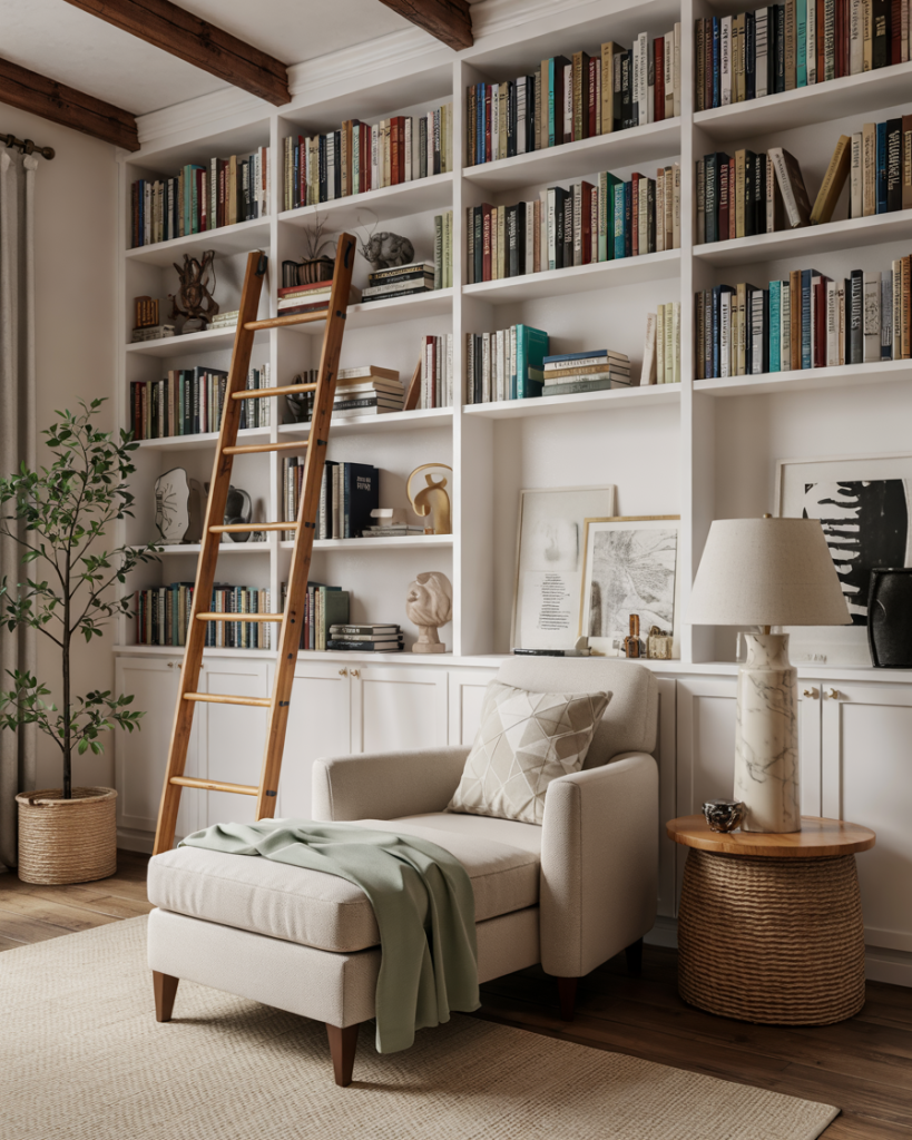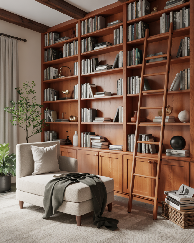 If you have high ceilings, build upward. Tall shelving plus a sliding ladder makes storage dramatic and functional. Add a chaise below, and you’ve got a movie-worthy book haven. Great for design lovers who want book decor to double as architecture.