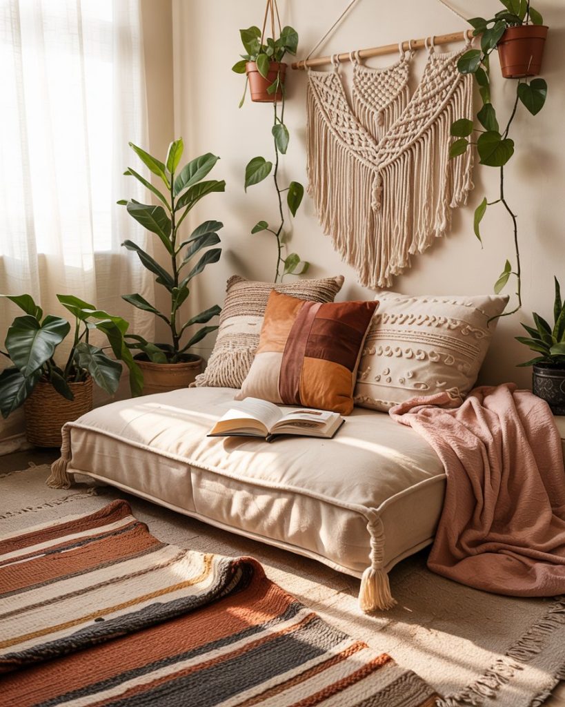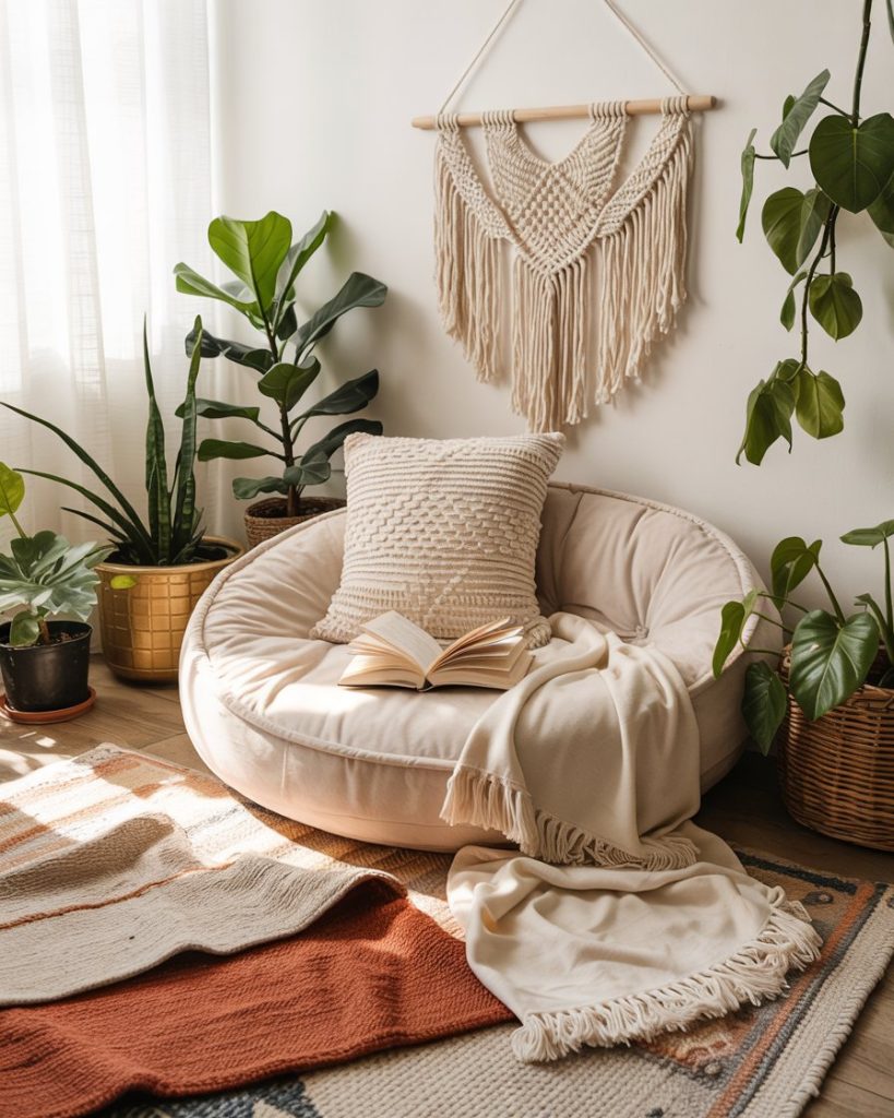 A relaxed Bohemian setup uses poufs, macrame, plants, and low tables. Perfect for renters or anyone who prefers a laid-back vibe. Works in a living room or bedroom and feels both artistic and grounded. The layered textiles make it visually rich while staying inexpensive to assemble.