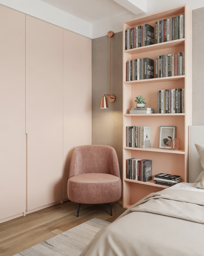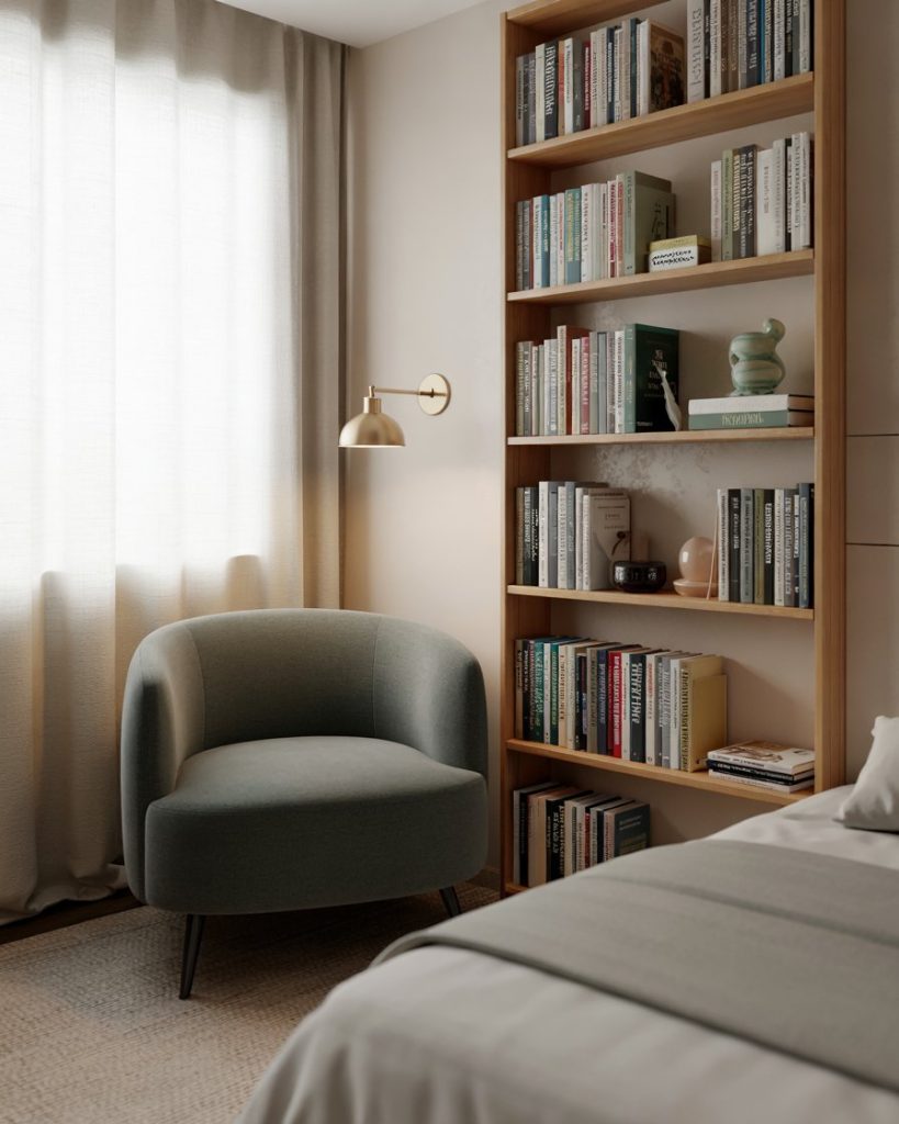 When dealing with small bedroom spaces, a single narrow bookshelf paired with a compact accent chair solves the storage-plus-comfort problem. Vertical shelving and wall-mounted lamps save square footage, proving you don’t need a whole room to build a ritual.