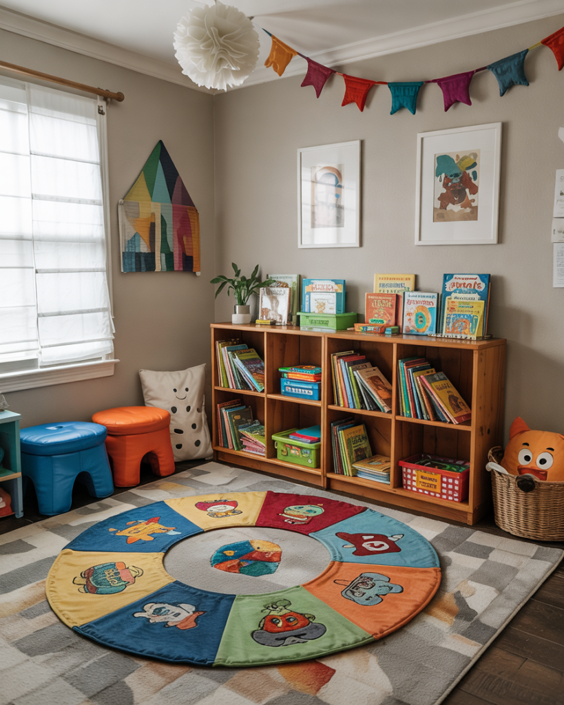 A playroom reading spot encourages kids to see books as fun, not homework. Add bright cubbies, character pillows, and wipe-clean mats. Experts at Reading Rockets say choice matters—rotate titles so kids feel every visit is new. Great for siblings of different ages.