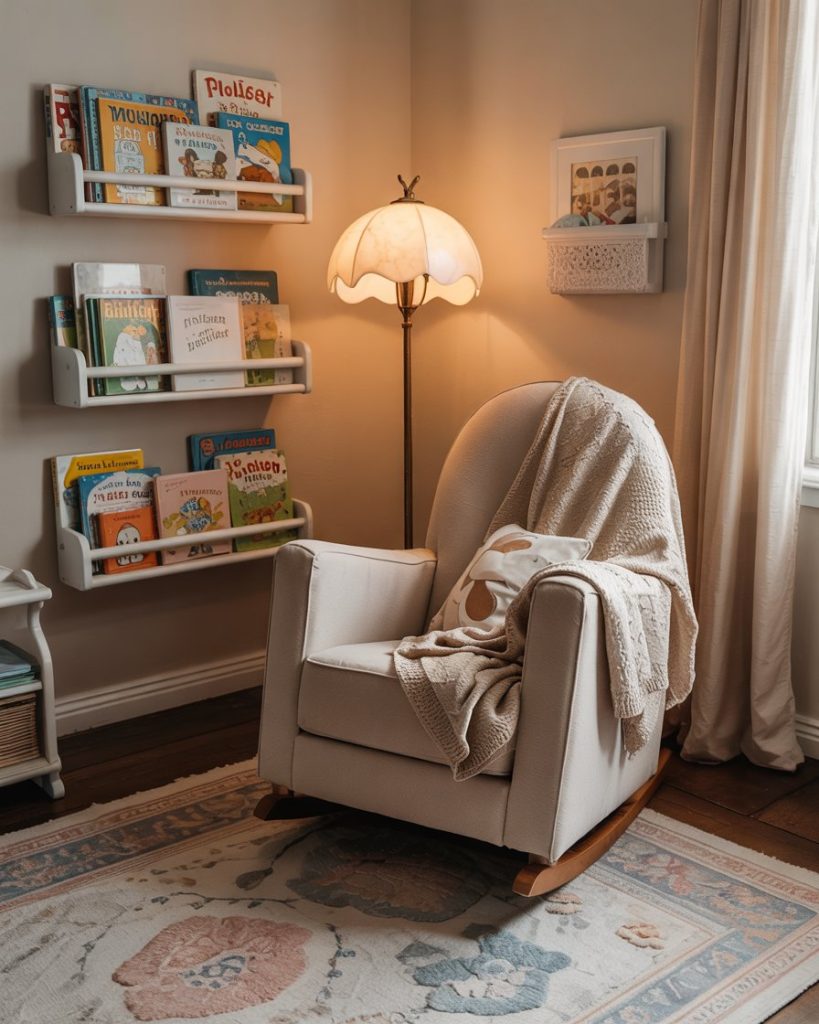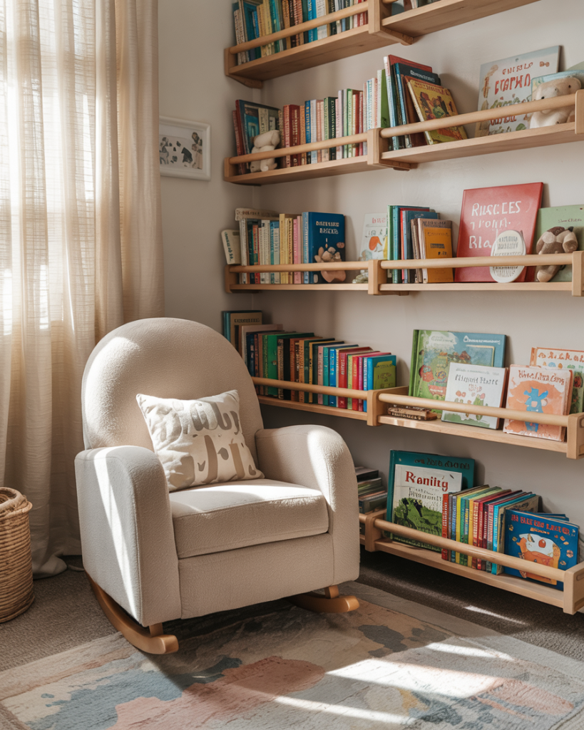 Parents know a rocking chair and dim lamp can save bedtime. Store picture books in wall racks and keep textures soft and soothing. This nursery setup grows with the child and later becomes a chill teen corner, making it a smart long-term design choice.