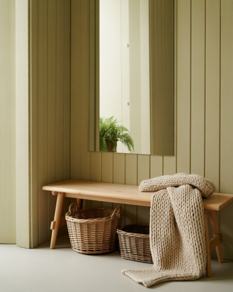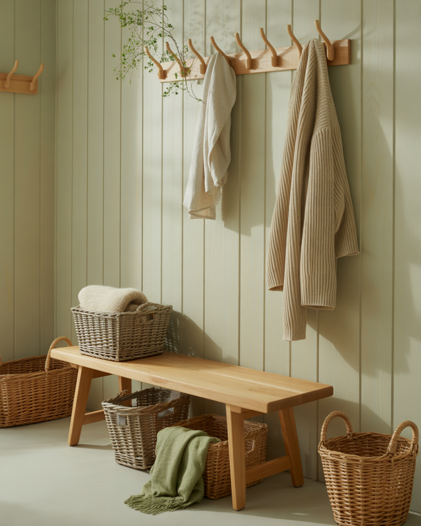 A rustic Nordic entryway uses woven baskets, simple benches, and warm woods to set a welcoming tone. This idea fits both cabins and suburban homes, offering functional charm. I’ve seen families quickly adopt this style because it organizes daily clutter without sacrificing beauty.