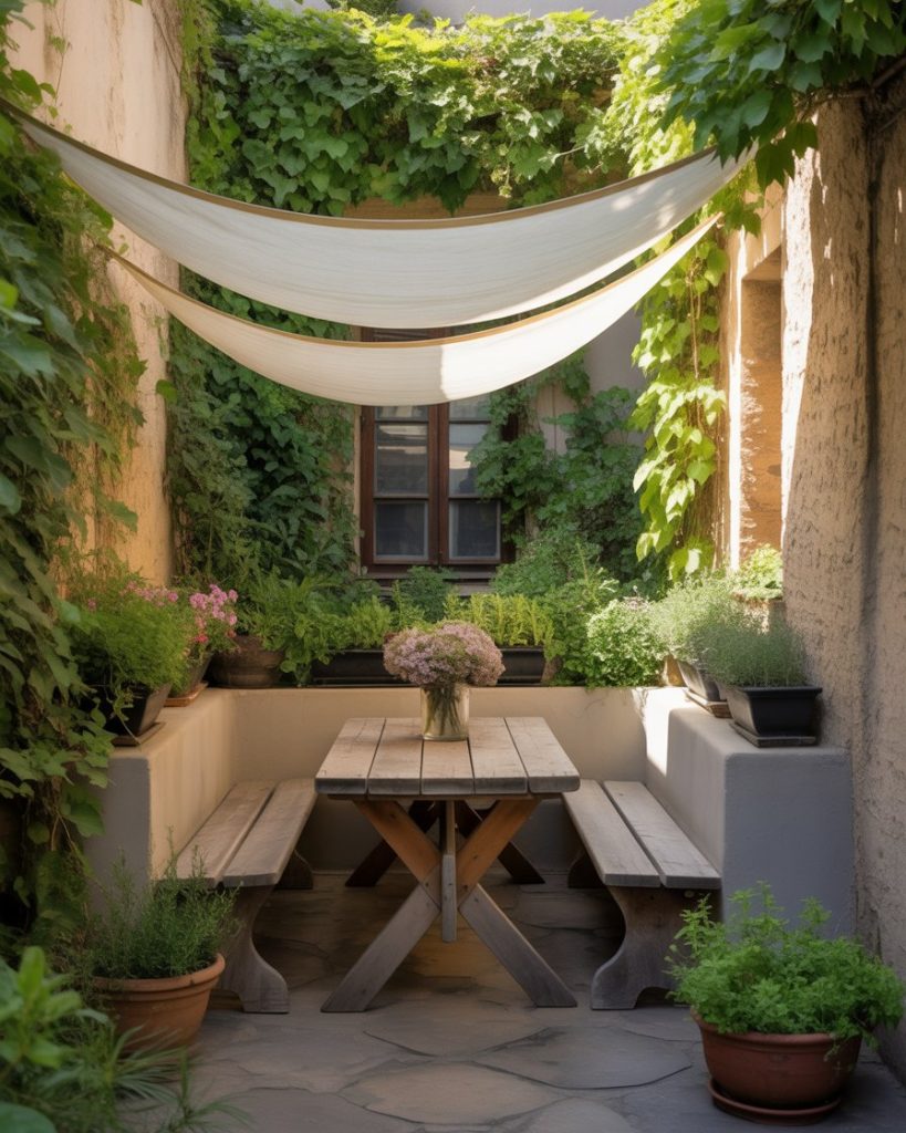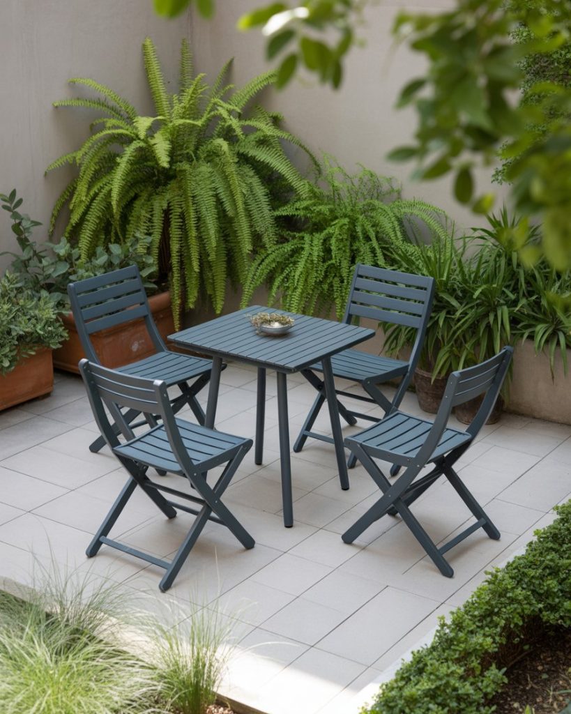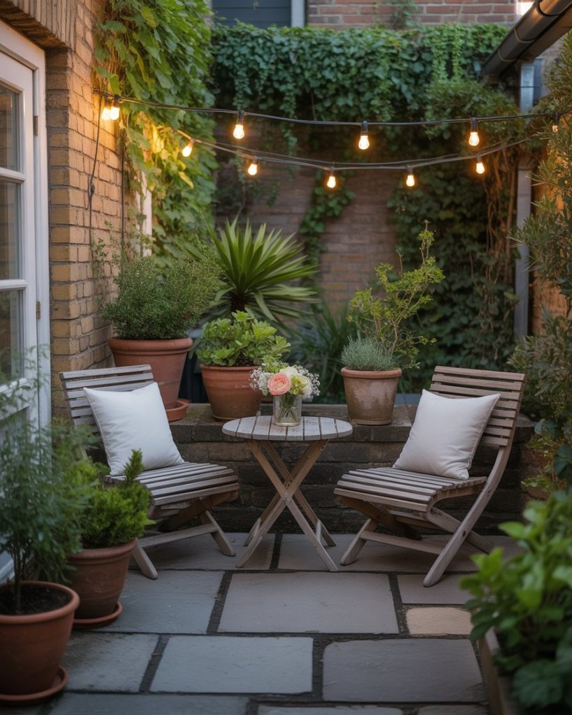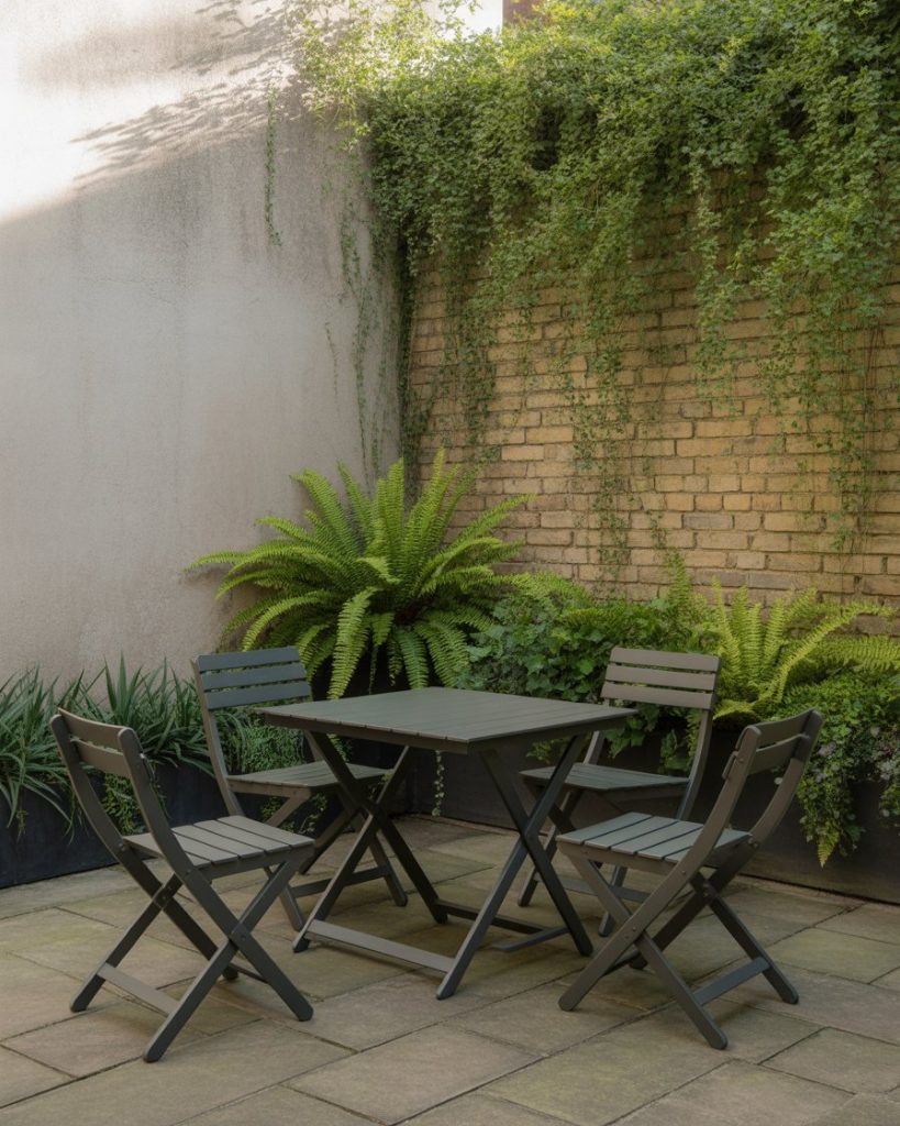 Compact furniture is ideal for small yards. Tables and chairs that fold or stack allow flexibility in your designs layout. This ideas simple approach maximizes usability while keeping the space open and uncluttered.