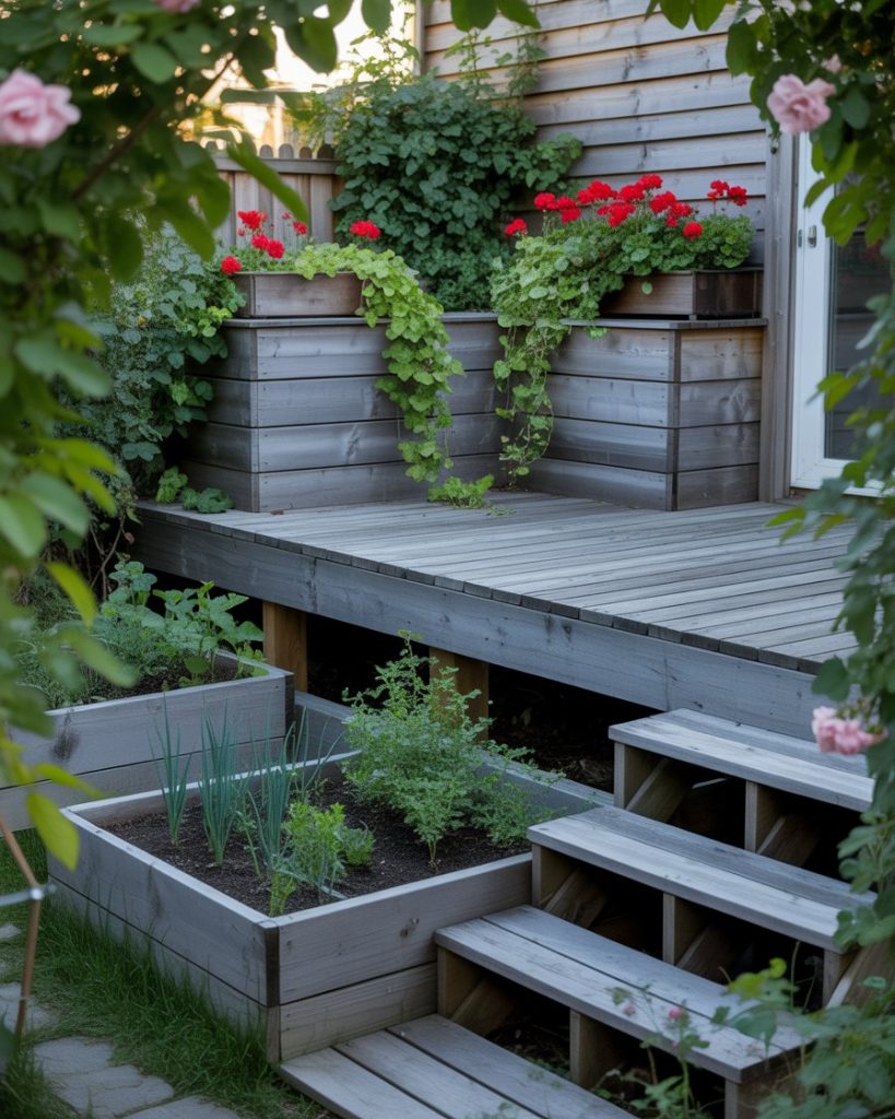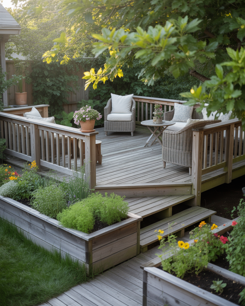 A tiered layout can make even a small space look grand. Use steps, decks, or raised planters for clever designs layout that separate areas for dining, lounging, and greenery. It’s one of the most creative ideas on a budget that adds depth and charm.