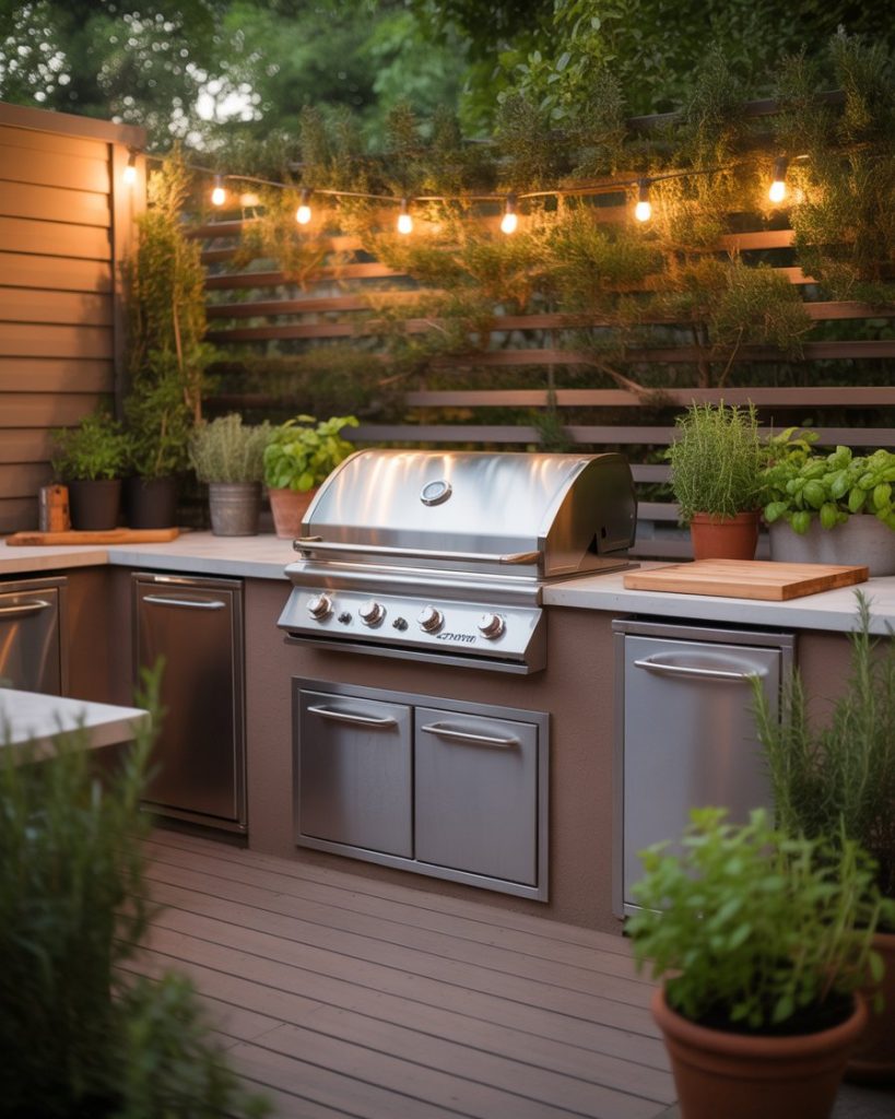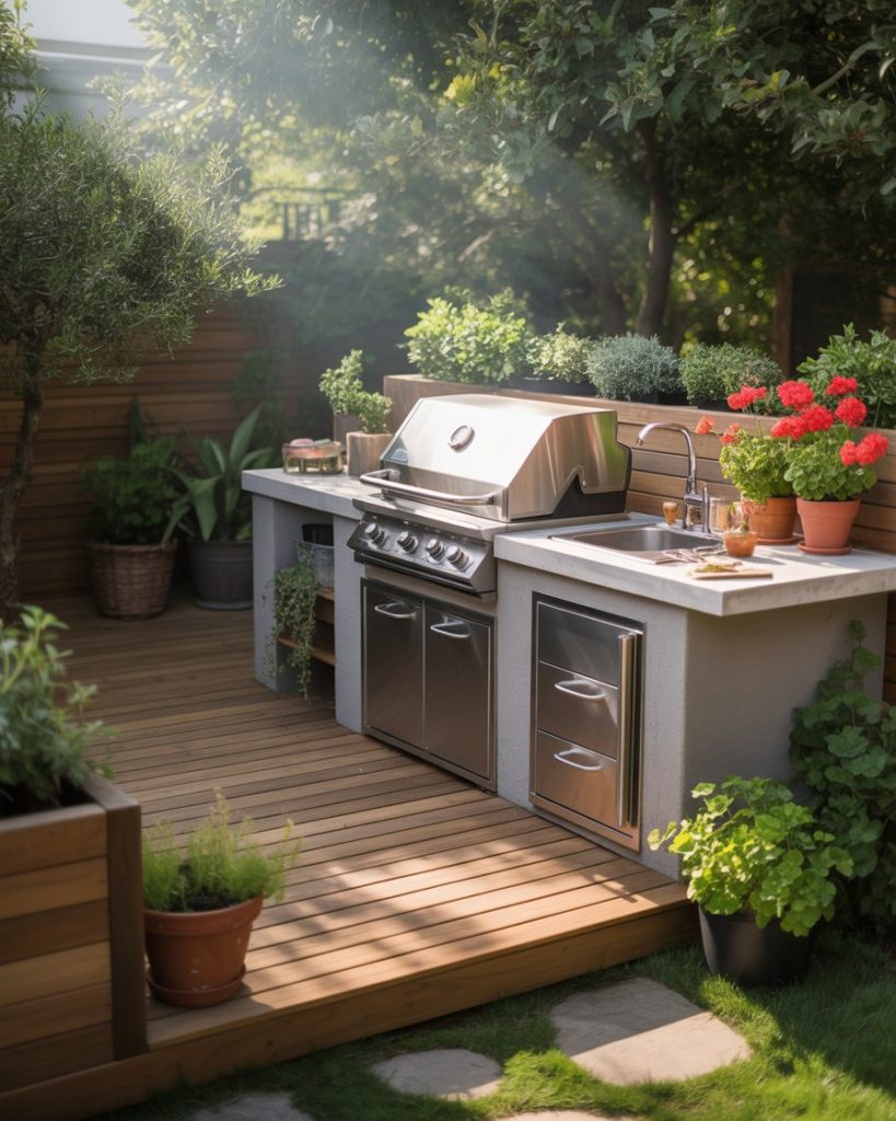 Cooking outside doesn’t require a large yard. Create a small design layout plan for a grill, prep space, and mini fridge. These ideas simple are practical and stylish, allowing you to entertain guests without ever leaving your garden.