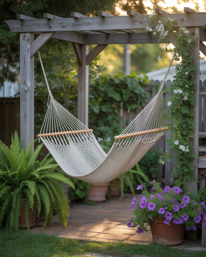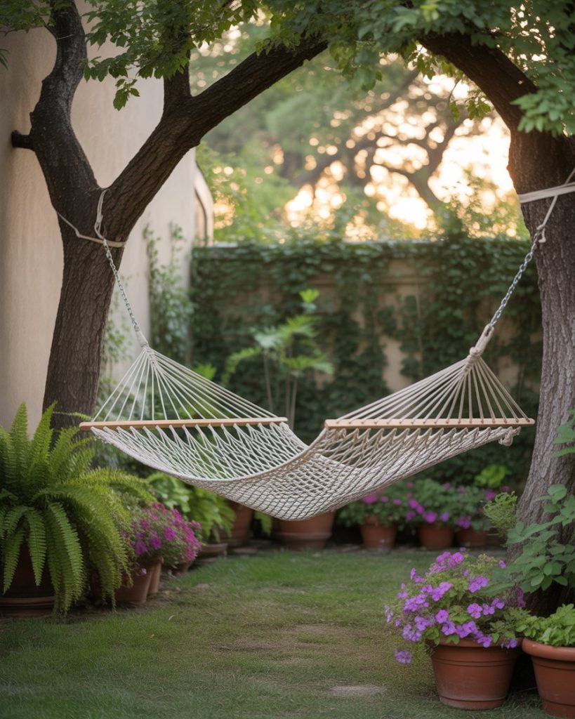 Relaxation is key in small spaces. A hammock adds comfort without clutter, fitting perfectly within any designs layout. It’s a great idea on a budget and creates a peaceful escape among grass, trees, or walls of greenery.