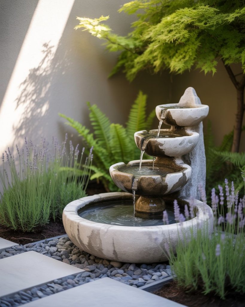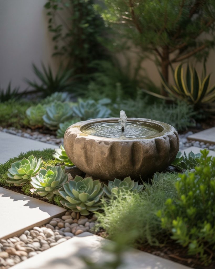 A gentle fountain or mini pond brings peace and natural sound to your backyard. This design layout plan works beautifully with stone, wood, or concrete bases. It’s a modern touch that fits perfectly with a budget simple garden ideas.