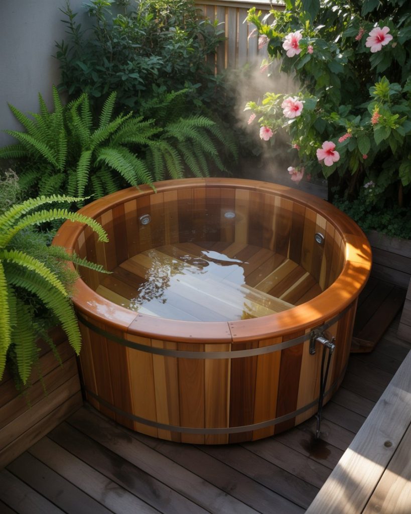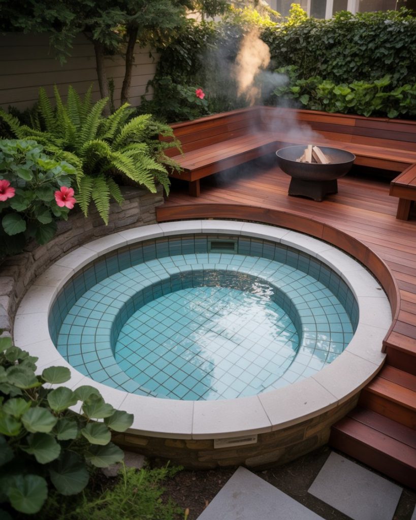 Compact spaces needn’t preclude a small pool or hot tub. With ingenious design layout and natural building materials, a home spa-like retreat isn’t impossible. Incorporate decking, lanterns, and surrounding greenery for a serene, simple yet stylish setup.
