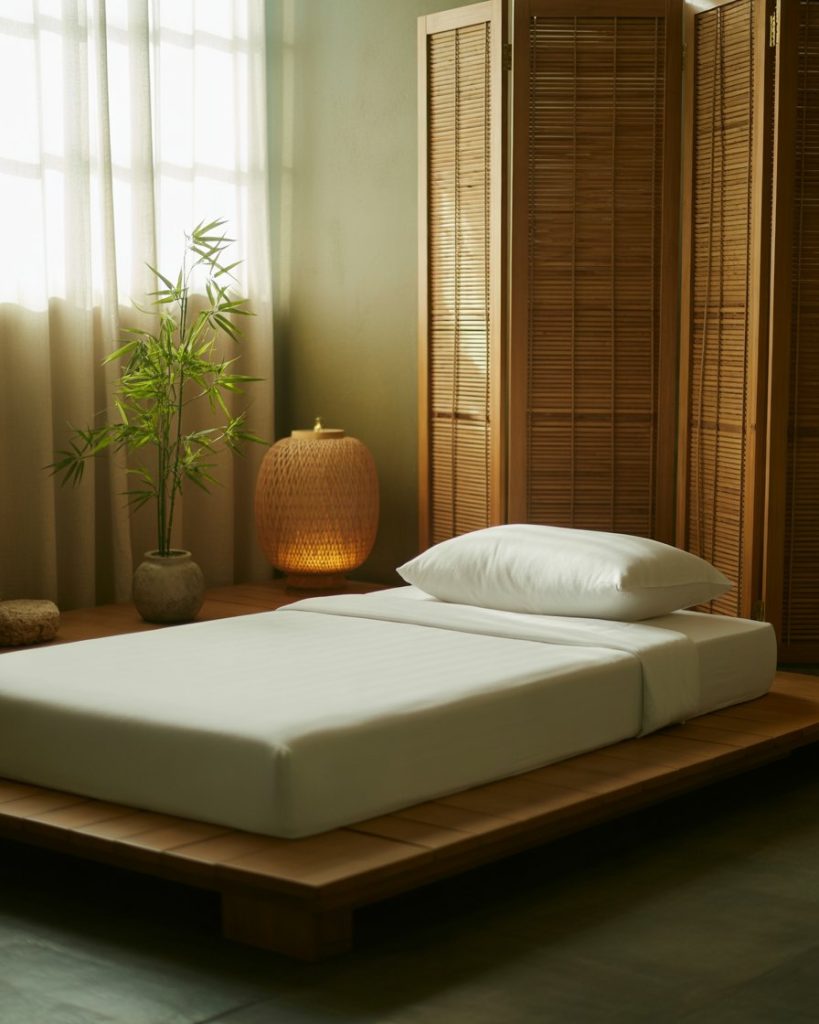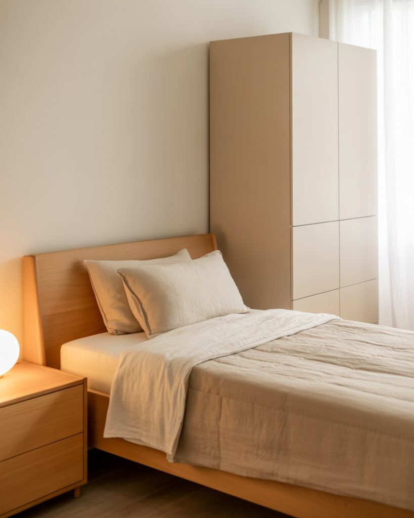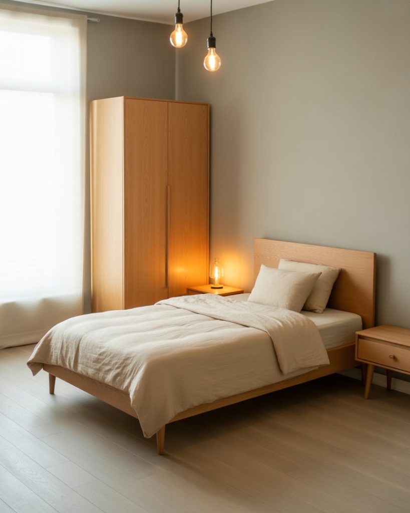 Inspired by Japanese simplicity, this simple design focuses on peace and balance. A low single bed, bamboo accents, and neutral fabrics make the space feel cozy, relaxing, and mindful. Ideal for couples or 2 sisters who want to escape daily chaos and embrace minimalist calm.