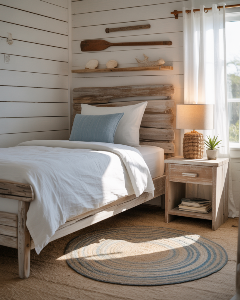 Bring seaside calm into your small space with a cozy aesthetic inspired by the ocean. Use whitewashed wood, linen bedding, and touches of soft blue. Even a single bed feels like a mini vacation spot. The layout should be simple and airy, perfect for couples or kids dreaming of beach getaways.