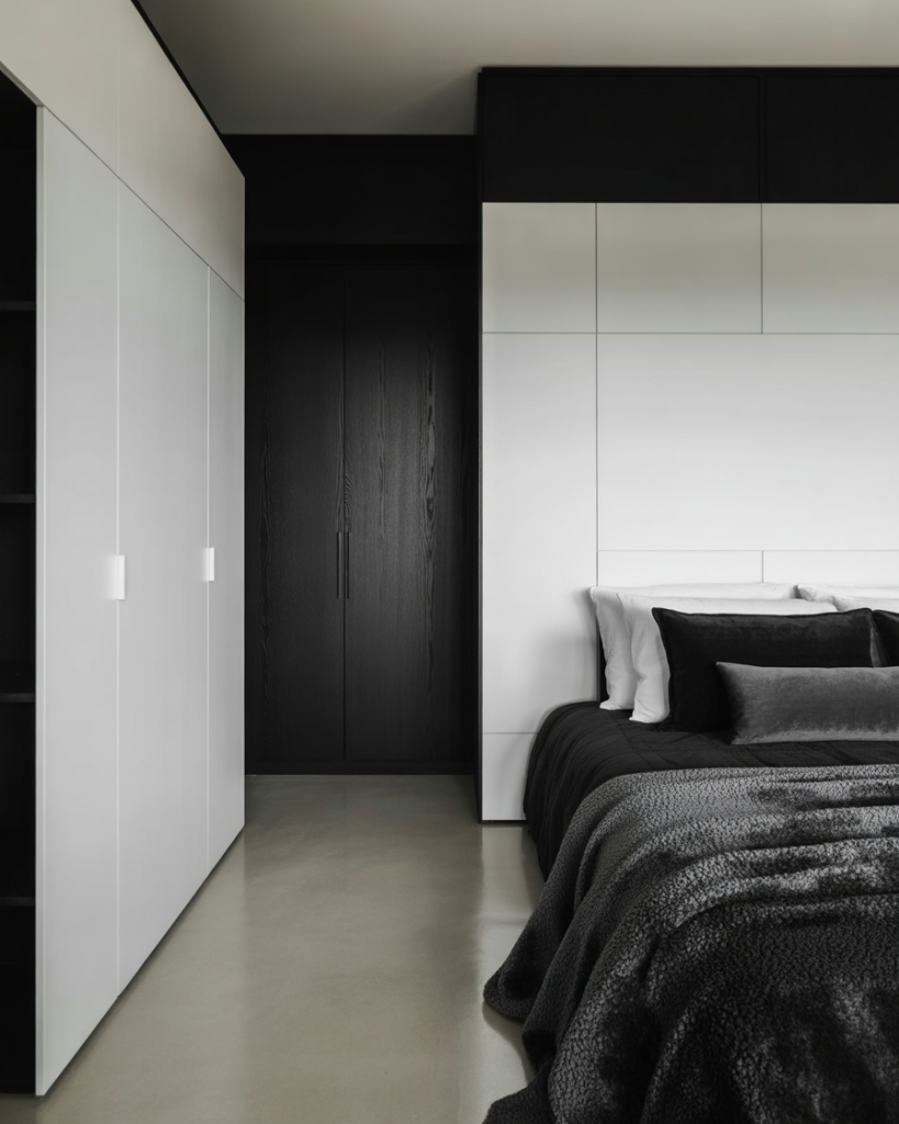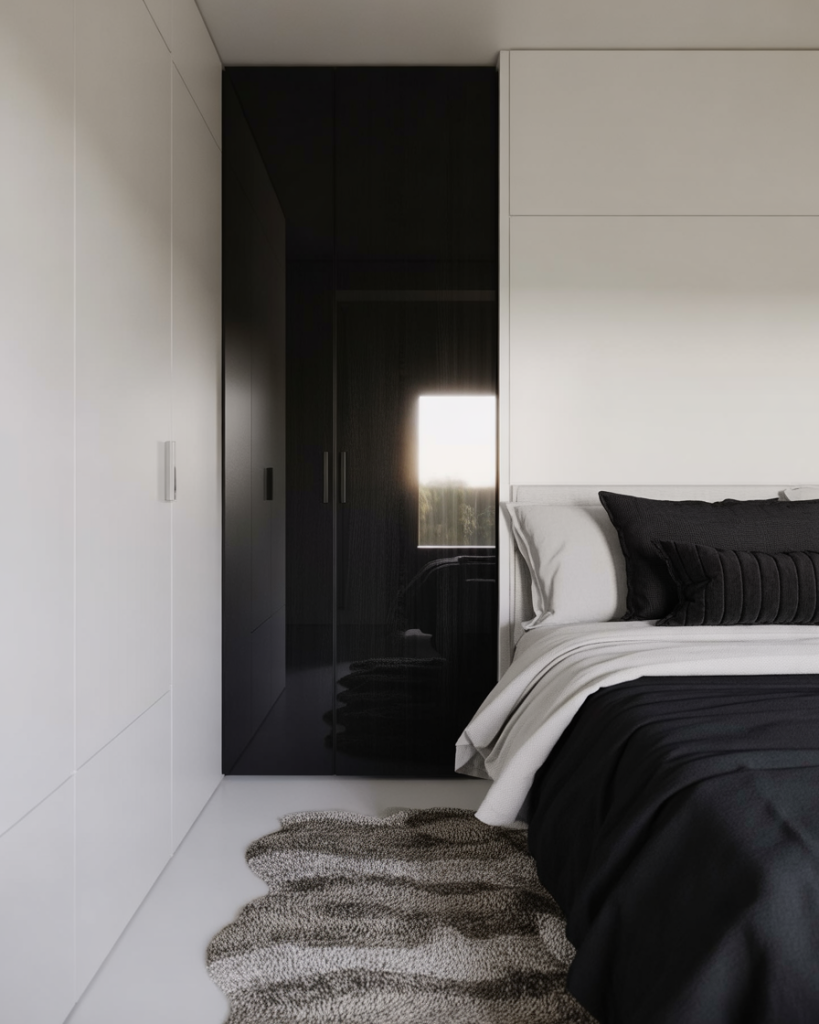 A bold monochrome modern design gives small bedrooms a sense of sophistication. Pair crisp white walls with black accents and a compact wardrobe for contrast. A simple layout keeps it sleek, while a cozy, relaxing rug softens the look. Great for couples who love minimal but dramatic spaces.