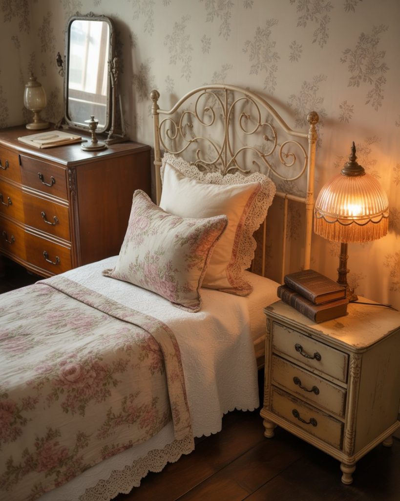 Give your small room nostalgic character with very charming vintage decor. A wrought-iron single bed, floral fabrics, and wooden furniture create a timeless cozy aesthetic. Add a soft lamp or antique mirror to enhance the aesthetic feel. Perfect for kids, teens, or anyone who loves a touch of old-world grace.