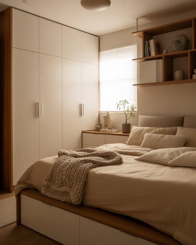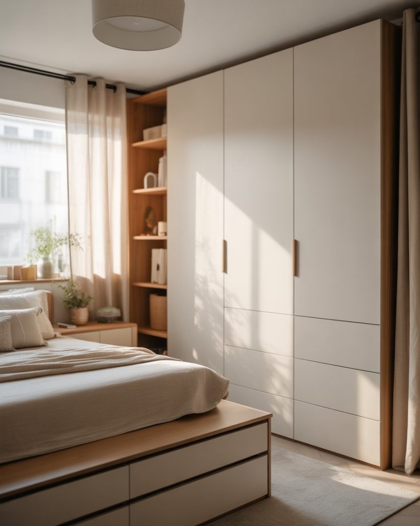 For tight spaces, storage is everything. Use an Ikea-style bed with drawers, a built-in wardrobe, and floating shelves for a simple yet super functional setup. This idea suits couples or 2 sisters sharing a small room. It’s a modern approach that keeps clutter hidden but style on display.