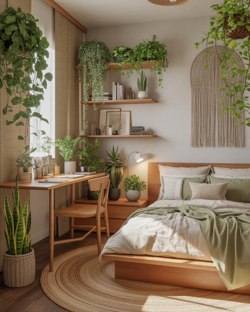 Bring the outdoors inside with natural wood, plants, and earthy tones. This cozy, relaxing idea works well for couples who crave calm or kids who love green spaces. A simple layout with an Ikea bamboo desk and neutral bedding keeps it light and fresh. The vibe is peaceful and extremely grounding.