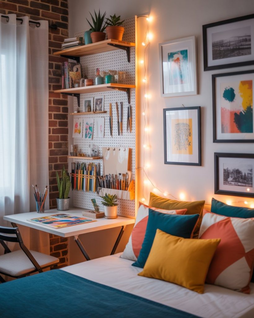 For teens or creative adults, a room that doubles as an art studio is inspiring. A foldable desk, wall-mounted supplies, and bright colors make it super practical. Even a single bed can be part of the aesthetic if you use patterned bedding. It’s very personal, modern, and full of energy.