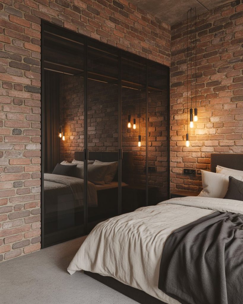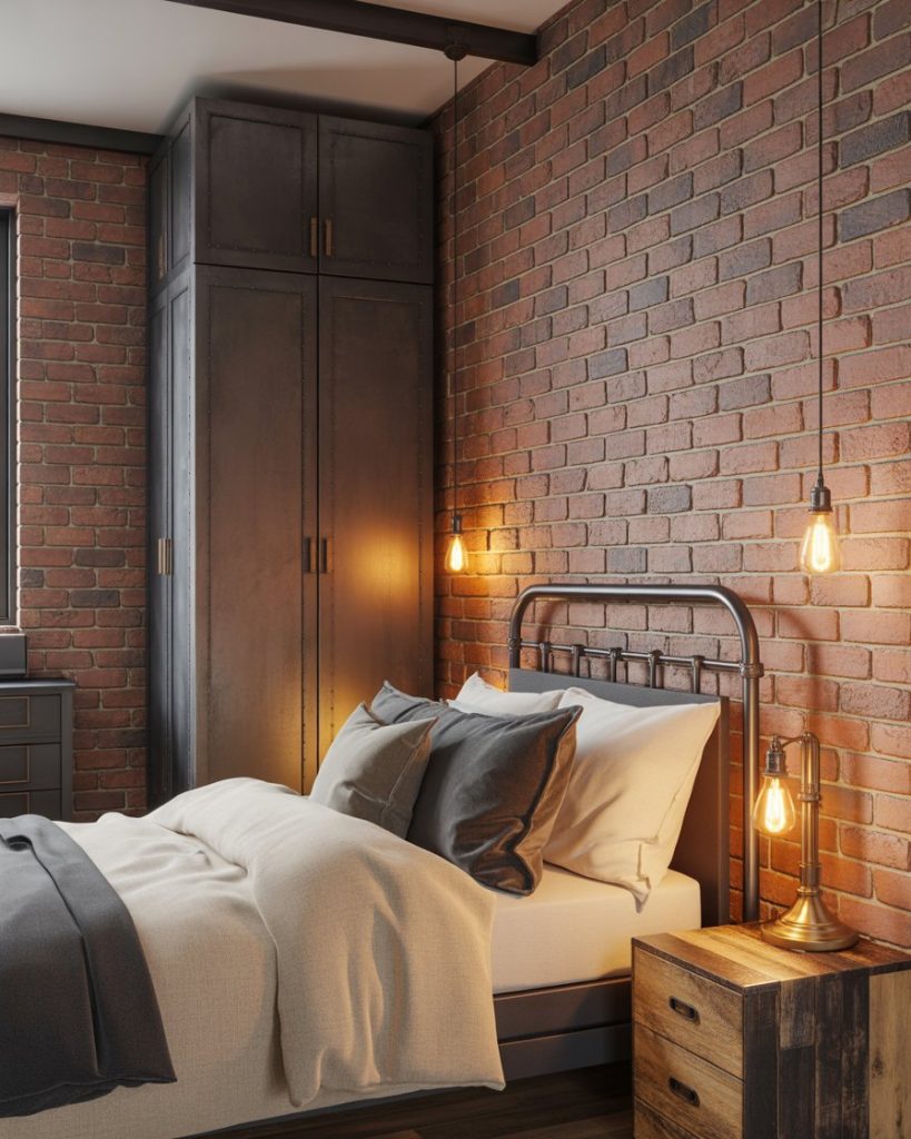 Industrial doesn’t have to be cold—combine brick, metal, and warm lighting for a cozy yet modern space. A minimalist wardrobe, string lights, and a neutral layout bring comfort without losing that edgy charm. This is great for creative couples or anyone seeking that very urban feel.