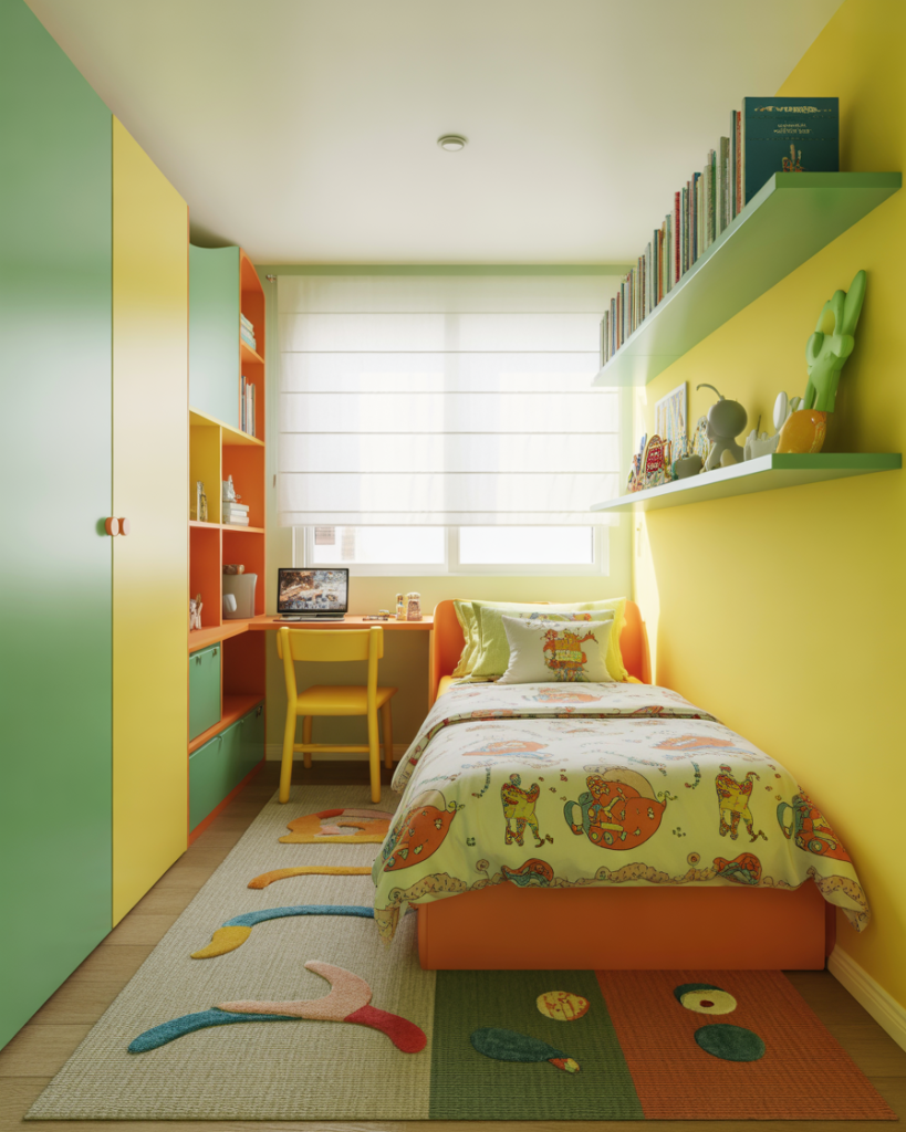 Small doesn’t mean boring! Add colorful rugs, themed bedding, and floating shelves for a super fun kids’ space. Even with a single bed, you can fit storage and a reading desk. Use safe materials and bright tones for an extremely cheerful aesthetic that encourages imagination.