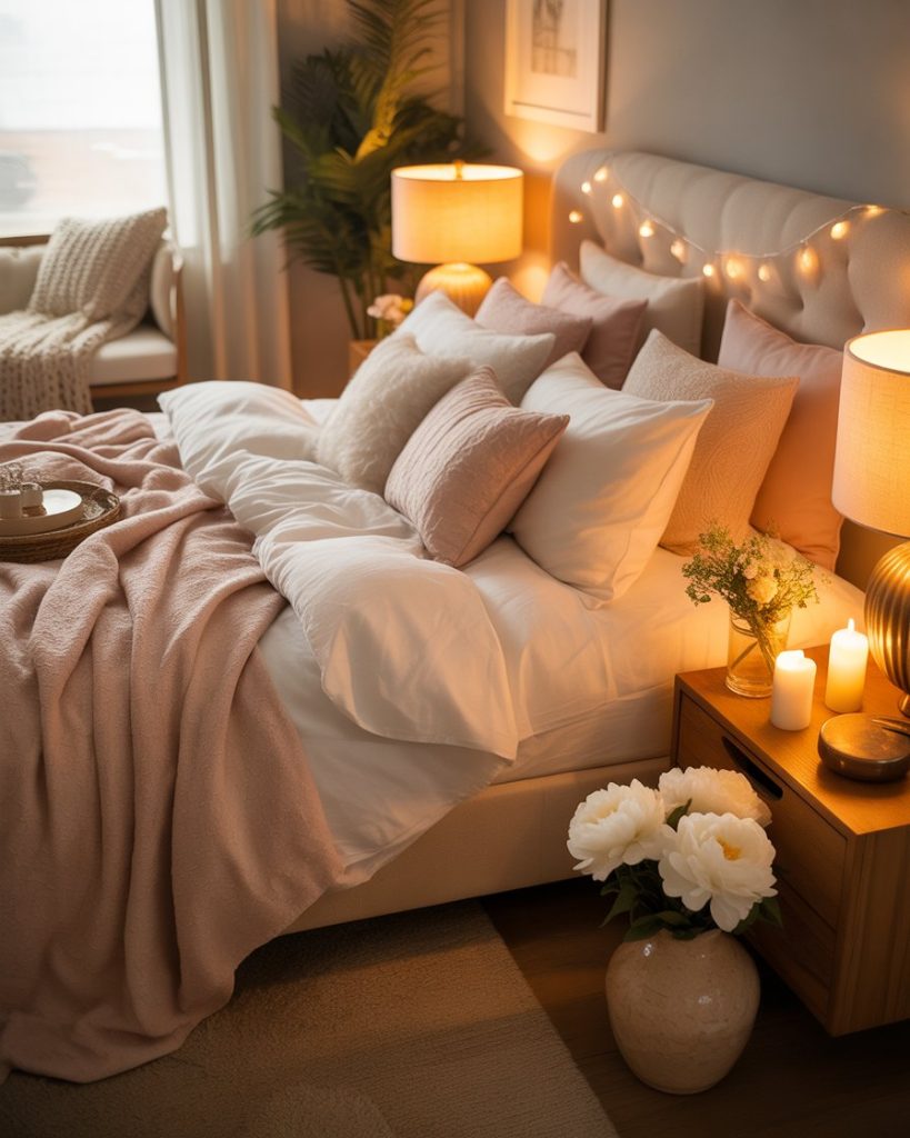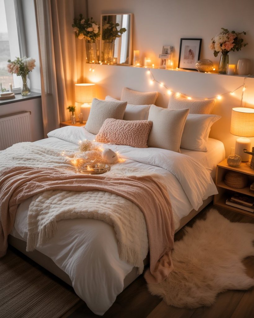 For couples, the cozy aesthetic is all about warmth, texture, and togetherness. Choose plush bedding, dim lighting, and layered textiles for a cozy atmosphere for couples. Even a king-size bed in a compact room can feel balanced with floating shelves and neutral tones. Take inspiration from Apartment Therapy’s cozy apartments for a romantic, very inviting look.