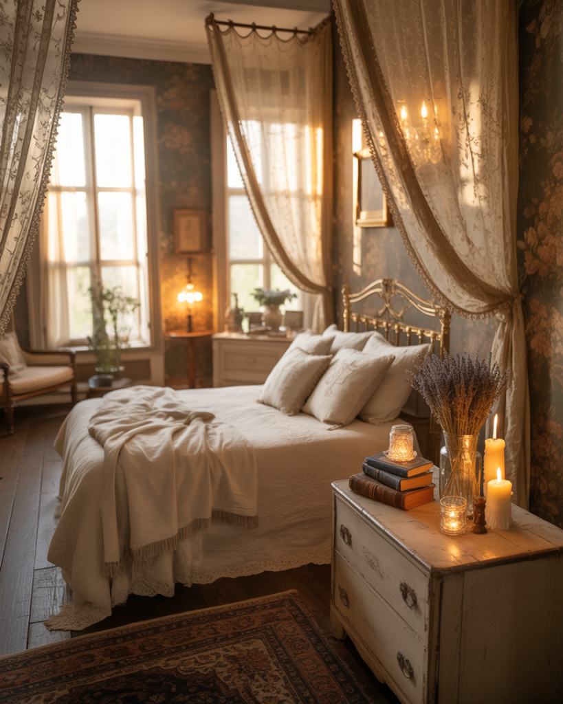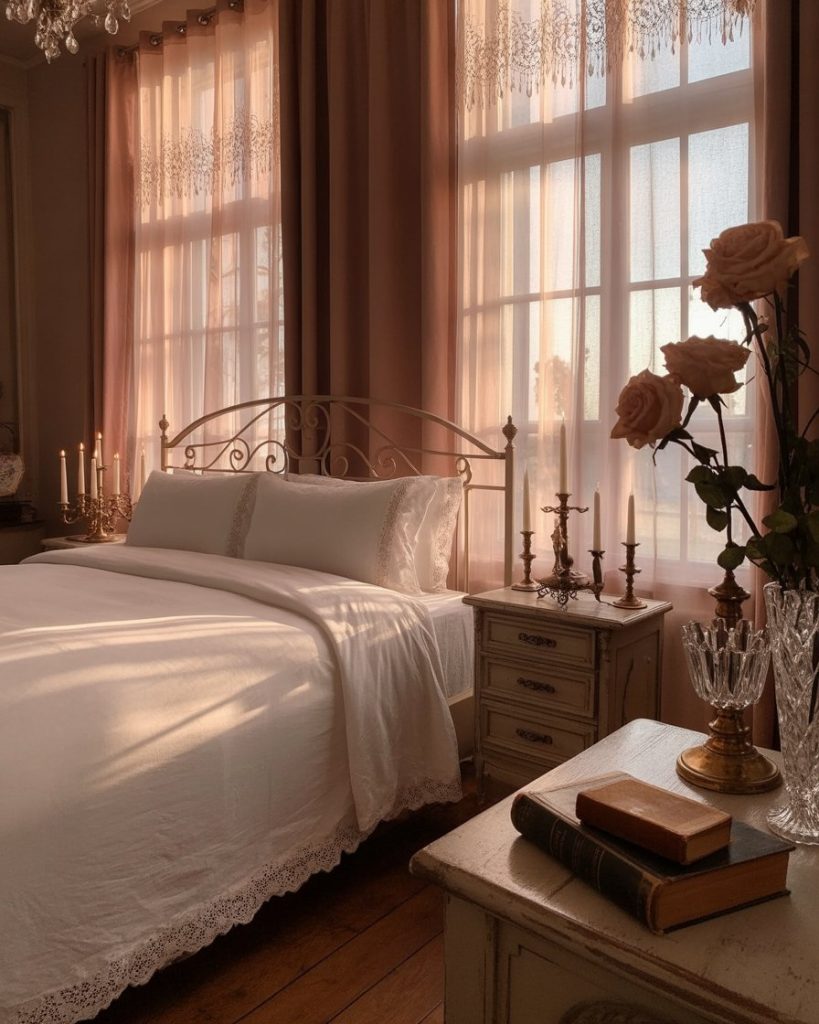This idea mixes vintage elegance with cozy aesthetic charm. Lace curtains, framed art, and soft lighting make a cozy retreat for couples. A king-size bed with embroidered linens turns even the smallest space into a very romantic getaway. It’s a timeless and heartwarming style.