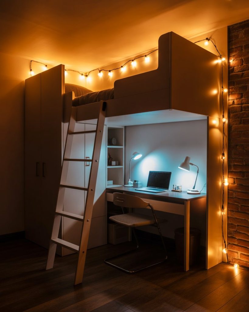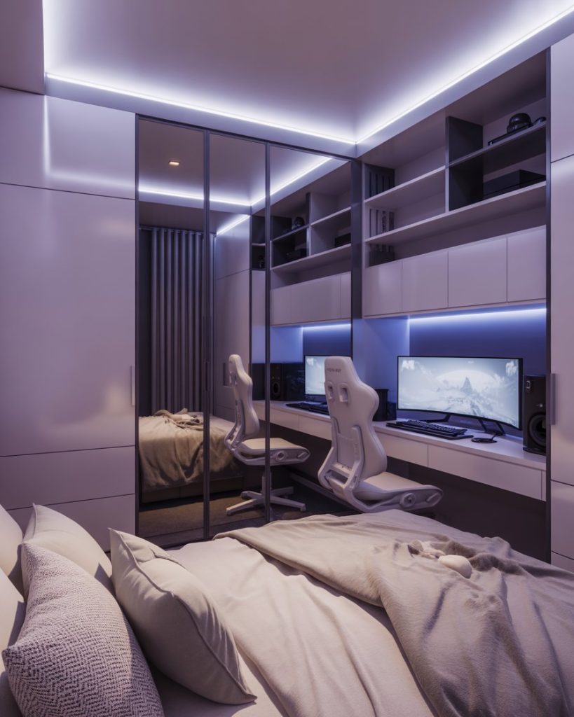 Inspired by Bloxburg mansions but adapted for real life, this idea blends modern luxury with small-space smarts. Use LED strips, mirrored wardrobe doors, and a sleek layout. A desk with a gaming setup adds personality. Perfect for teens or couples who love digital aesthetics with a real-world twist.