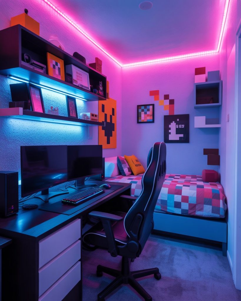 For teens and gaming enthusiasts, a Bloxburg-inspired room is full of super creative energy. LED strips, posters, and a compact desk make it both stylish and practical. A single bed with storage underneath keeps clutter away, while references to Minecraft-style builds add a fun touch. Perfect for small apartments or shared rooms.