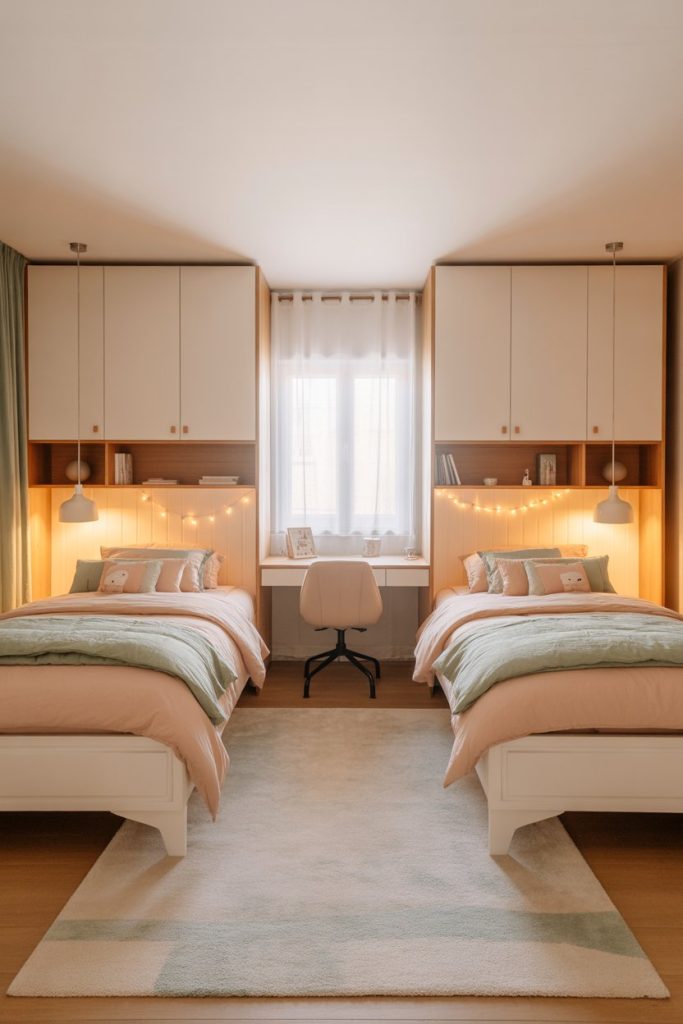 Designing a shared space for 2 sisters means blending individuality with harmony. Matching wardrobe units, cozy rugs, and modern lighting help define each area while maintaining unity. Add neutral bedding with accent pillows for balance. This setup is extremely functional, stylish, and ideal for small family homes.