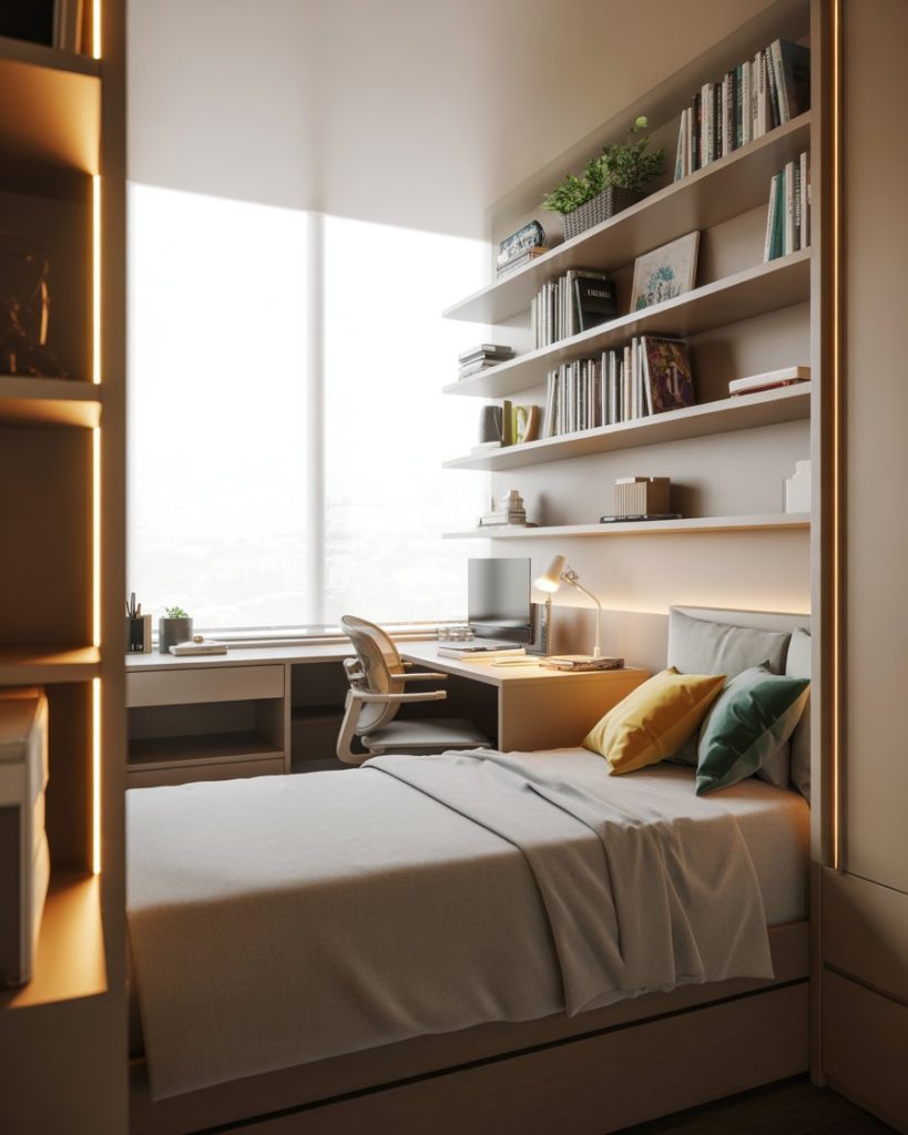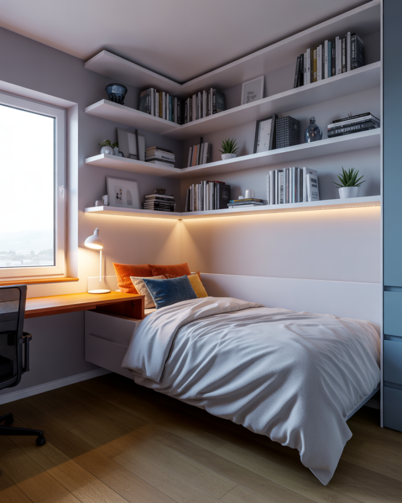 When teens need to balance school and rest, a well-planned layout with a built-in desk is key. Modular Ikea furniture offers extra storage without taking up space. A simple single bed, neutral tones, and LED lighting create a cozy and productive zone that grows with them. It’s practical and effortlessly modern.