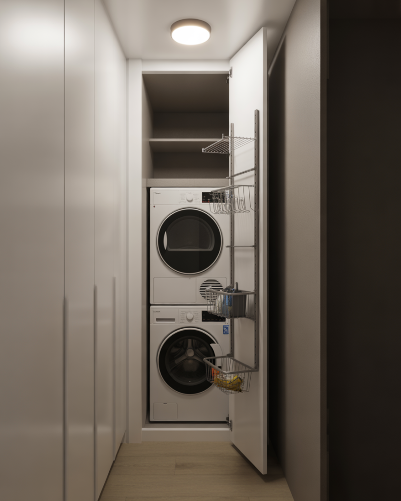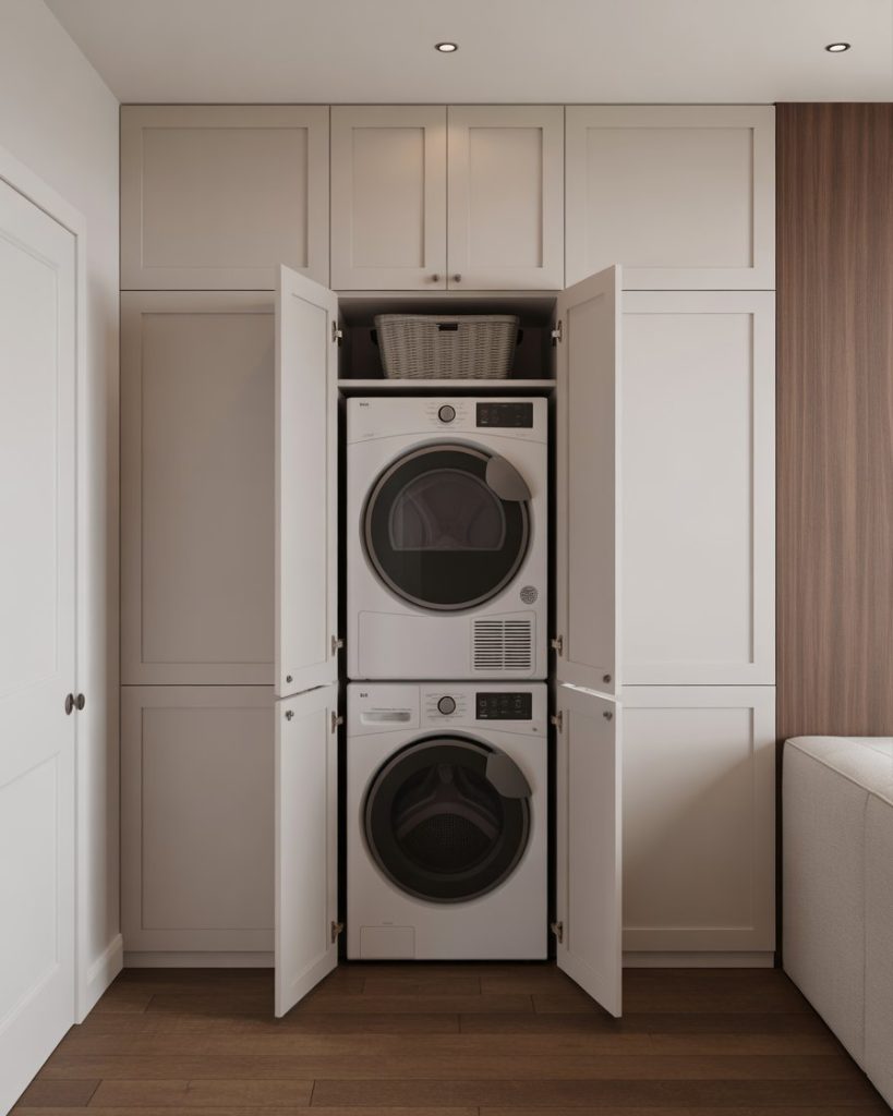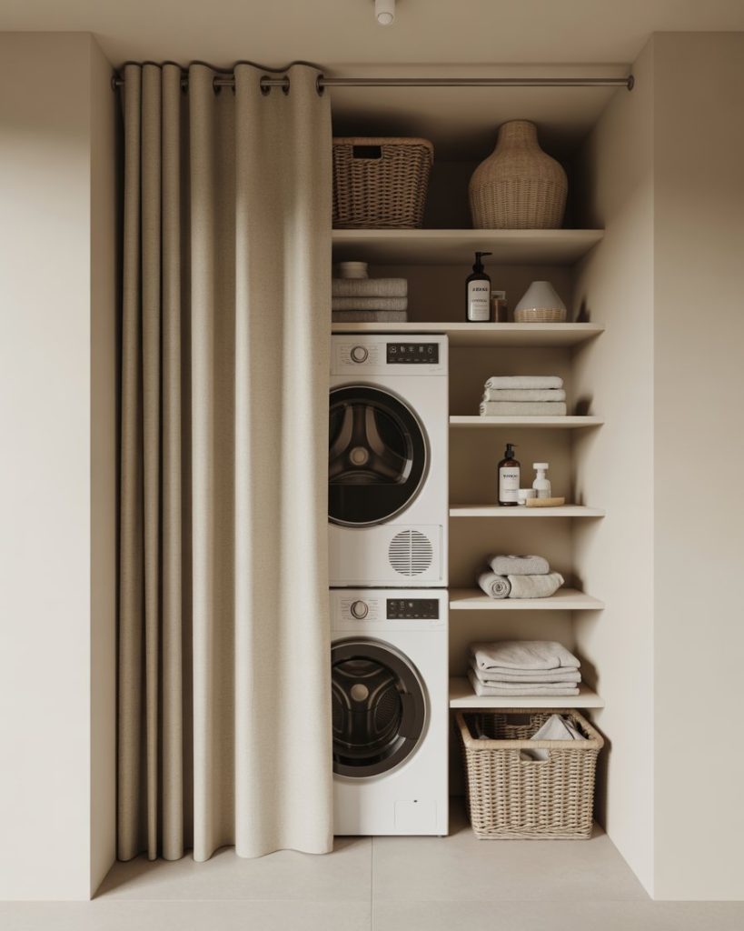 Using stackable machines is still the most space-saving trick for a closet-sized room. Pair a stacked washer and dryer with slim shelves for detergents, and you instantly free floor space for a hamper or pet bed. I first saw this setup in a friend’s studio, where the laundry tower stood behind a curtain—simple, neat, and landlord-approved. Works best for renters who can’t change plumbing but want a clean look.