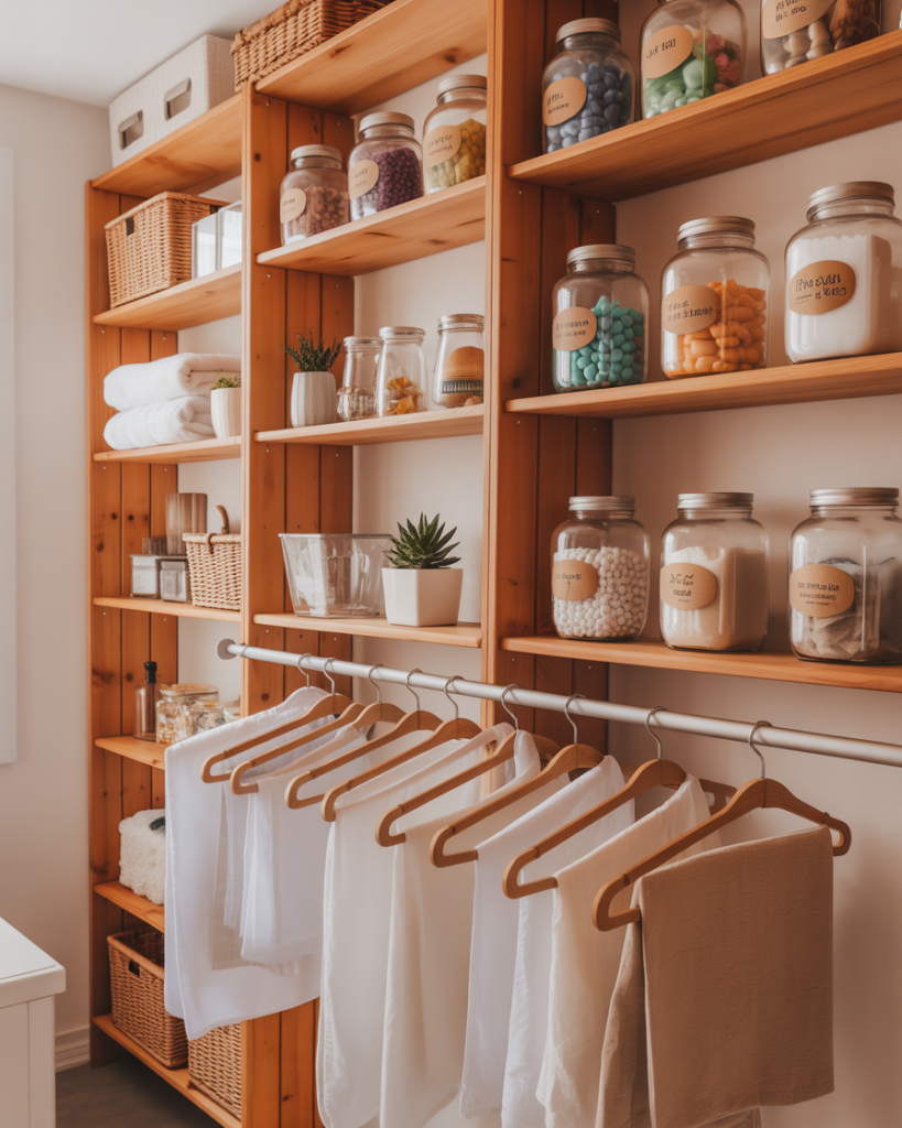 For a more budget-friendly option, omit the doors and use raw pine shelves and clear jars for pods and clothespins. A single tension rod can be used to hold hang-dry shirts. It looks super intentional if you use a single color palette, like all white or all amber jars. It’s inexpensive, cheerful, and endlessly hackable.