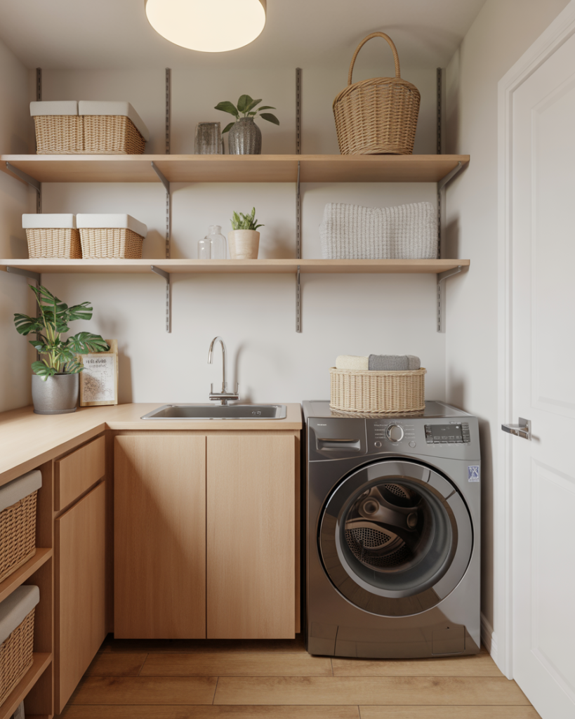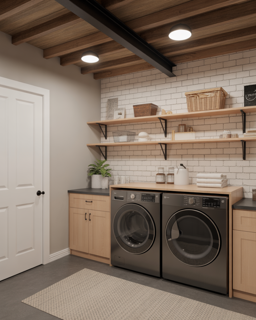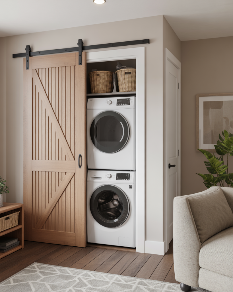A forgotten corner can hold stackable machines tucked behind a slim sliding barn door. This simple trick keeps noise down and frees the rest of the room for storage or crafts. I copied this after seeing it in a Denver condo where every inch mattered, and the result felt custom—without custom prices.