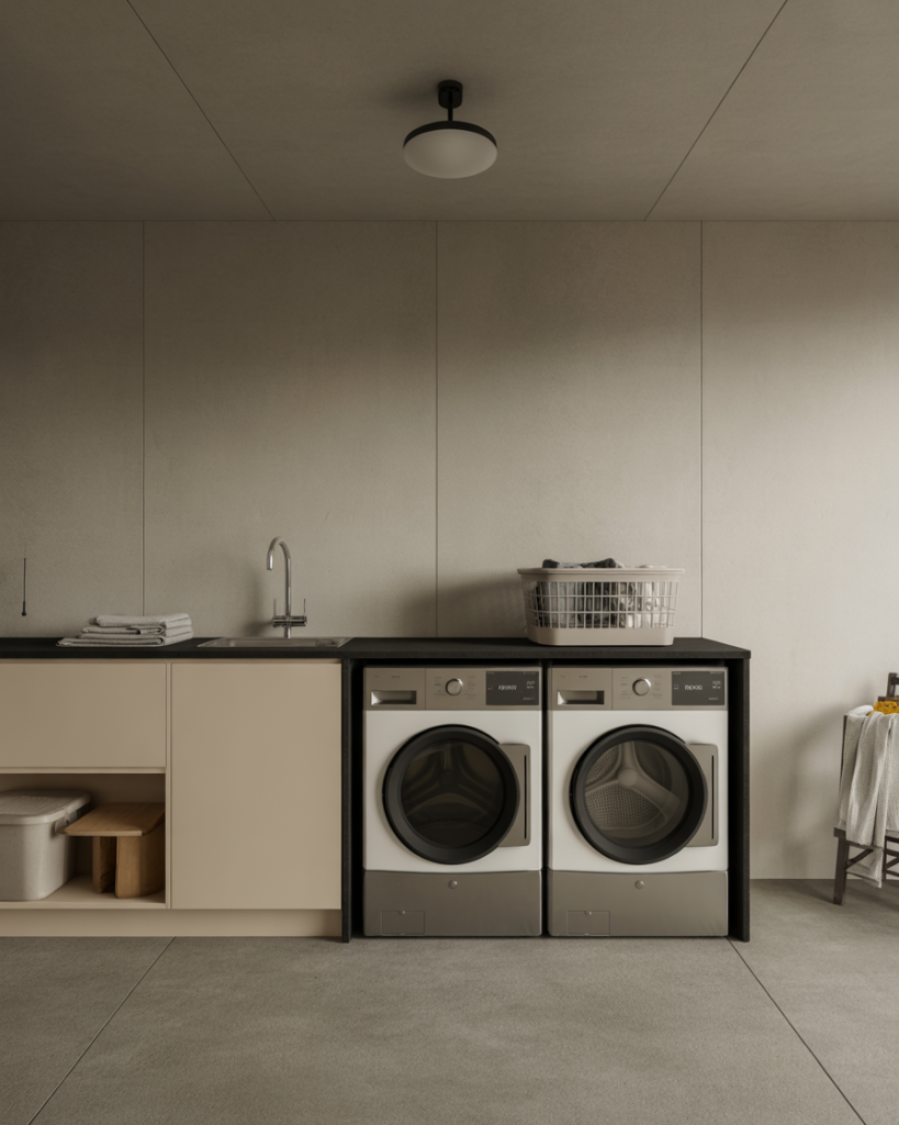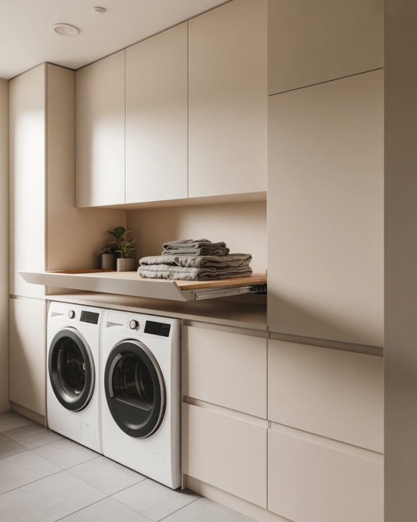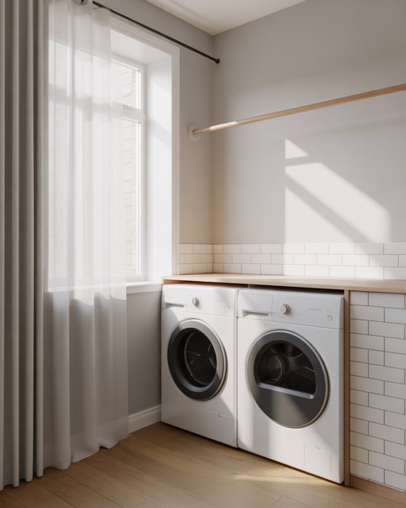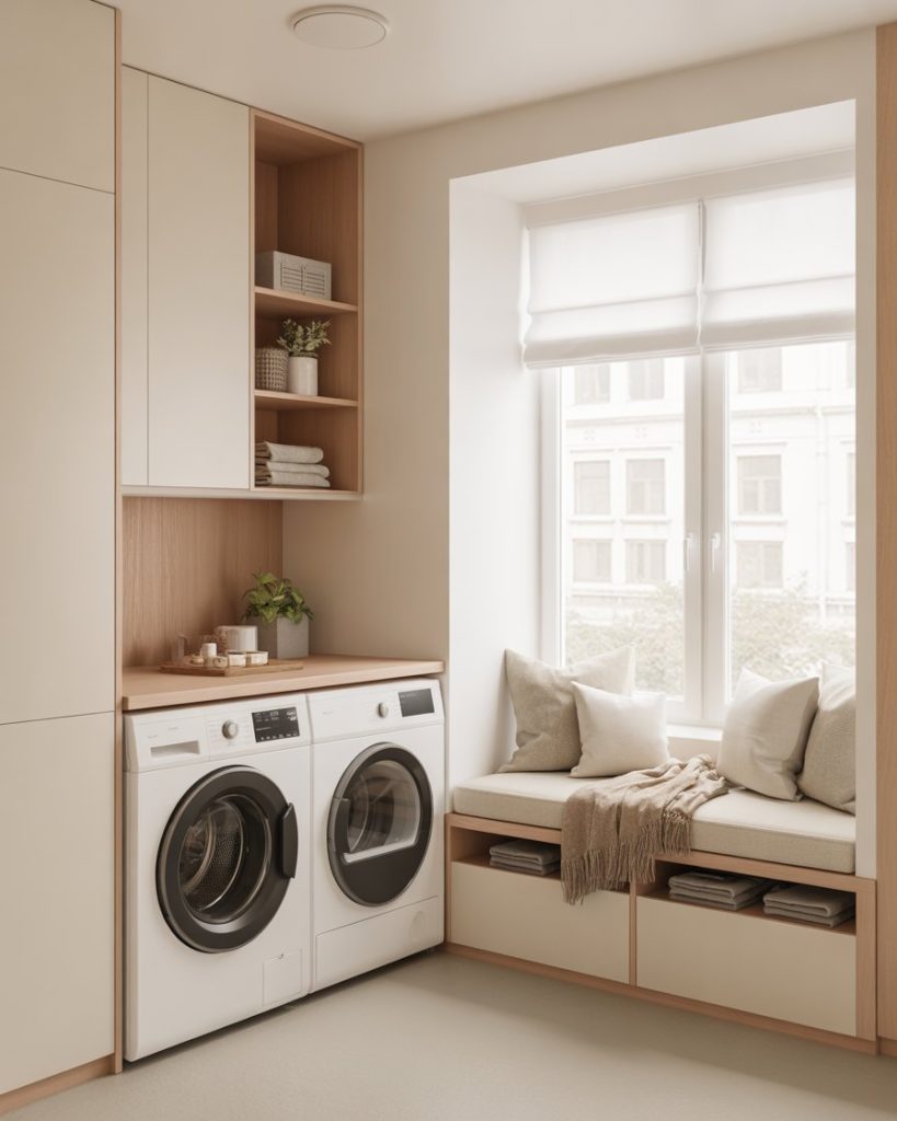 Place machines on one wall and build a window bench opposite—suddenly the chore zone becomes a reading nook too. The window adds mood, and the bench hides hampers underneath. It’s a designer favorite because dual-purpose rooms feel super intentional.