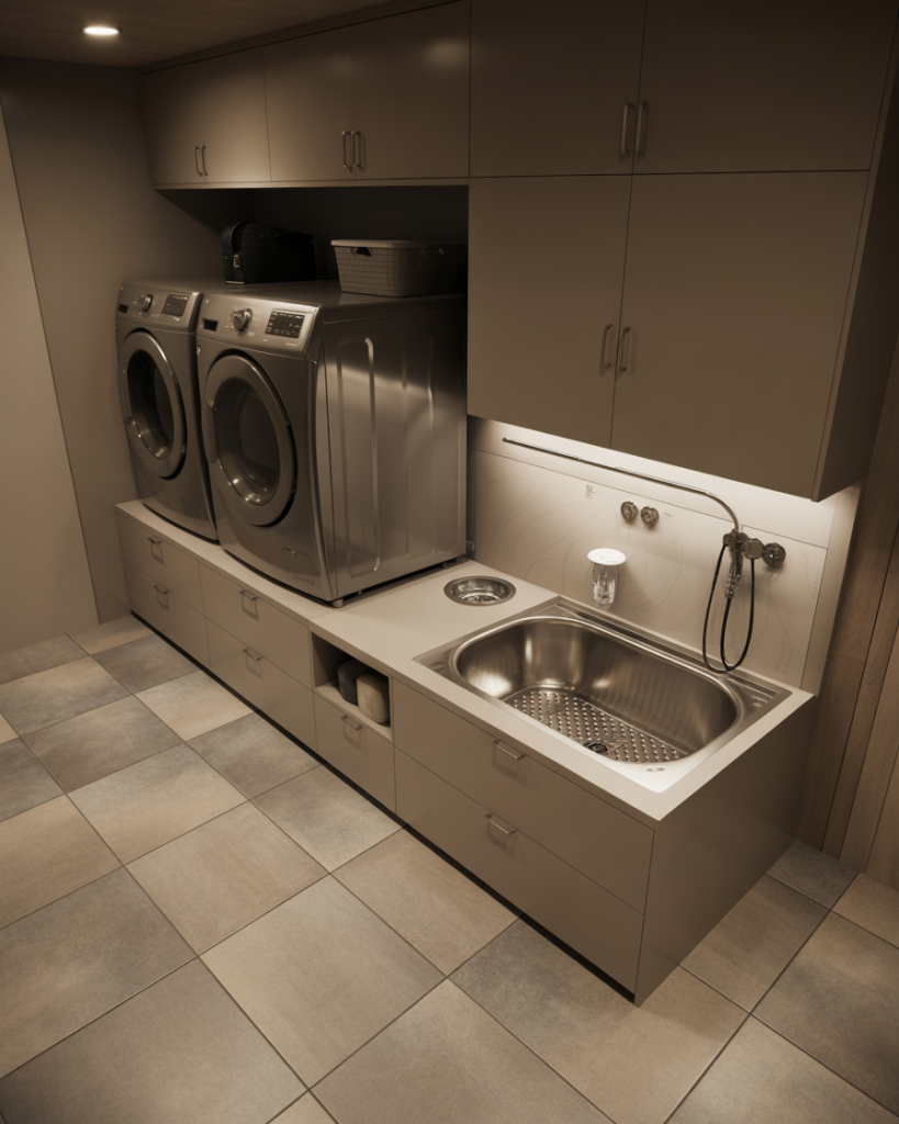 A raised platform for machines plus a small sink or pet shower below makes a multitasking zone. Families with dogs love this—no more muddy paws in the tub. Add stackable storage shelves for shampoo and towels.