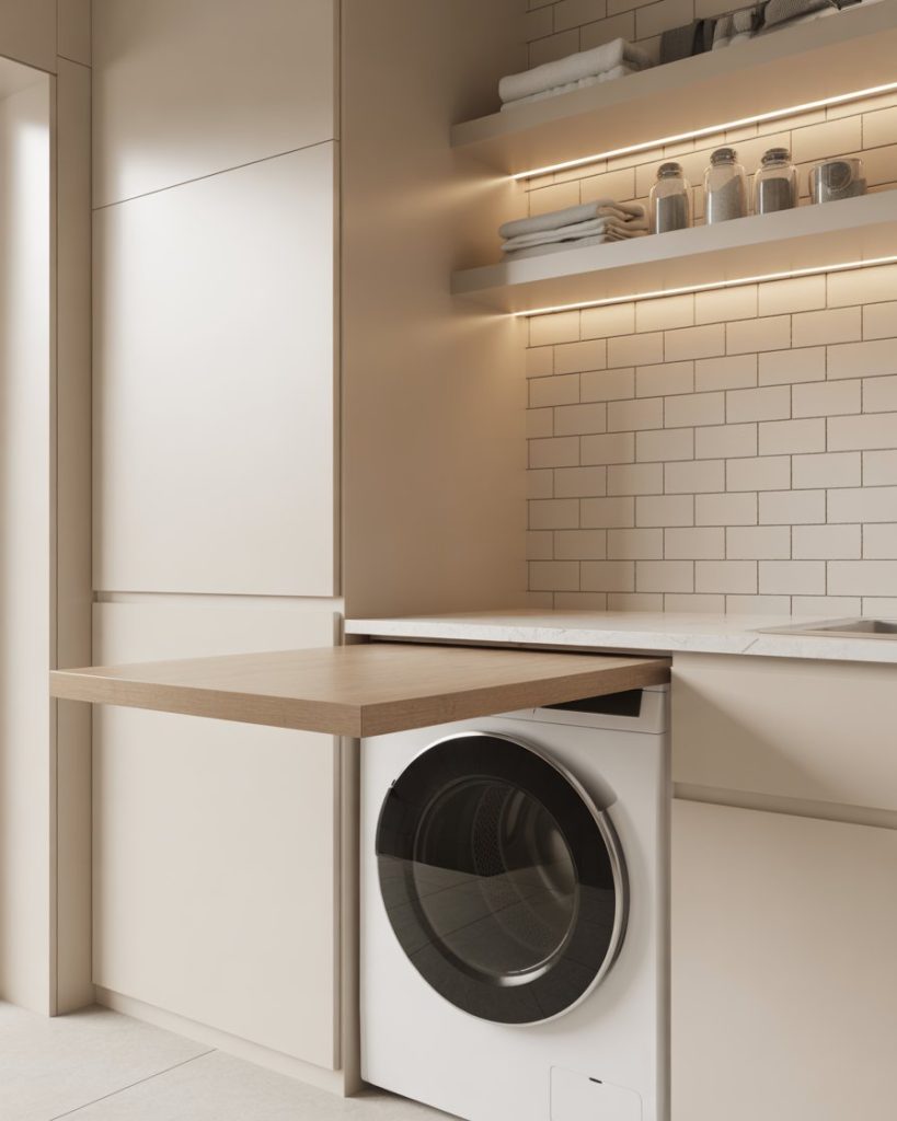 An all-in-one washer-dryer frees vertical space, so use it for a long wall-mounted folding table. Keep the surface shallow so you can still walk by—ideal for galley layouts or tiny apartment kitchens.