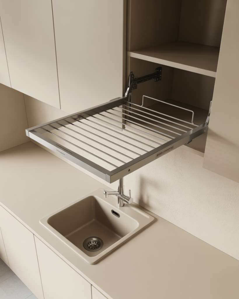 Install a flip-down drying rack inside a cabinet door above the utility sink. It keeps delicates out of sight and away from dust. One small hardware upgrade, huge organization payoff.