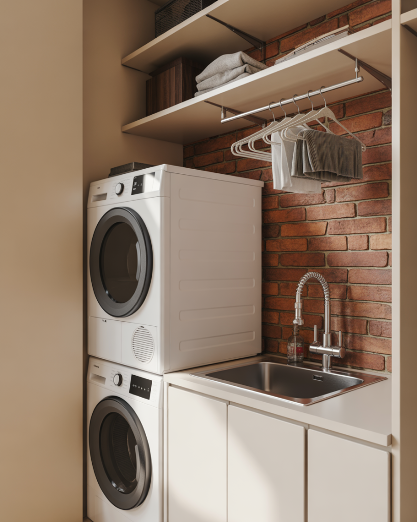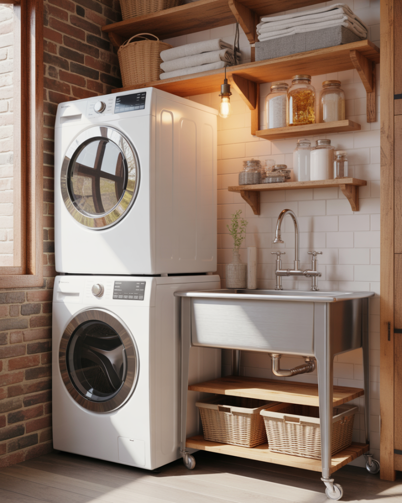A stackable setup with a sinkkeeps a compact utility sink right beside the tower, ideal for soaking gym clothes or paintbrushes. This solves the “where do I rinse?” problem in an apartment with no tub. Add a rail for microfiber cloths, and you’ve got a mini mudroom. I saw this in a 500-sq-ft loft and instantly copied the sink layout for my rental.