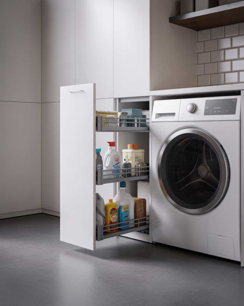 A 6-inch pull-out cabinet between the washer and wall can hold stain spray, pods, and dryer sheets—no bulky carts needed. It’s cheap, renter-friendly, and looks custom. Take that, wasted gap!