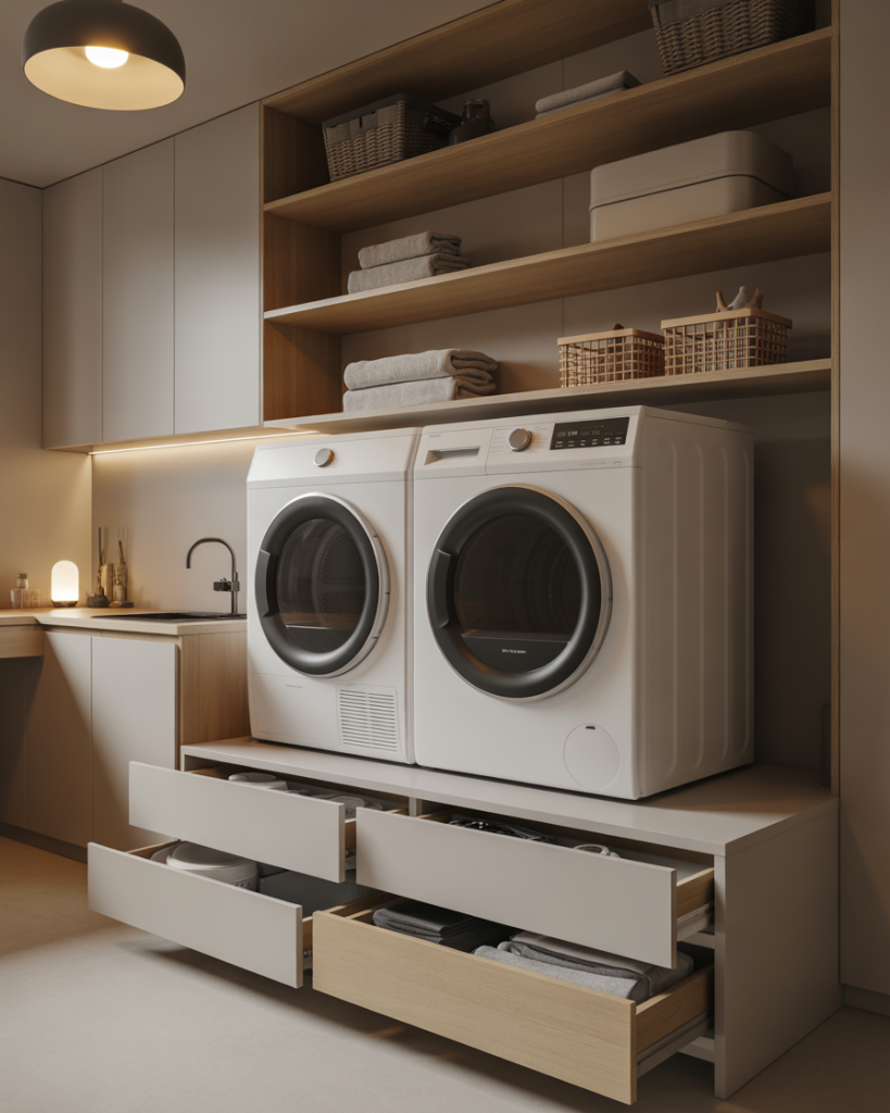 A raised washer and dryer platform turns dead floor area into pull-out bins for bulk detergent or pet food. Pair it with stackable storage shelves above, and you’ll never crawl on the floor for lost socks again. HGTV designers note the elevation also reduces bending—your spine will thank you after a year of towels.