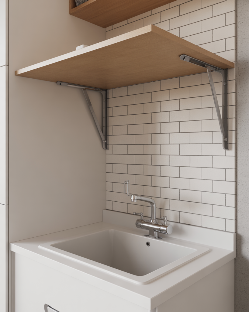 A deep utility sink paired with a counter lip that bridges over it instantly creates fold space without losing washing depth. Apartment Therapy calls this “Swiss-army furniture” for laundry. It’s renter-friendly: the counter lifts off when you need full basin height.