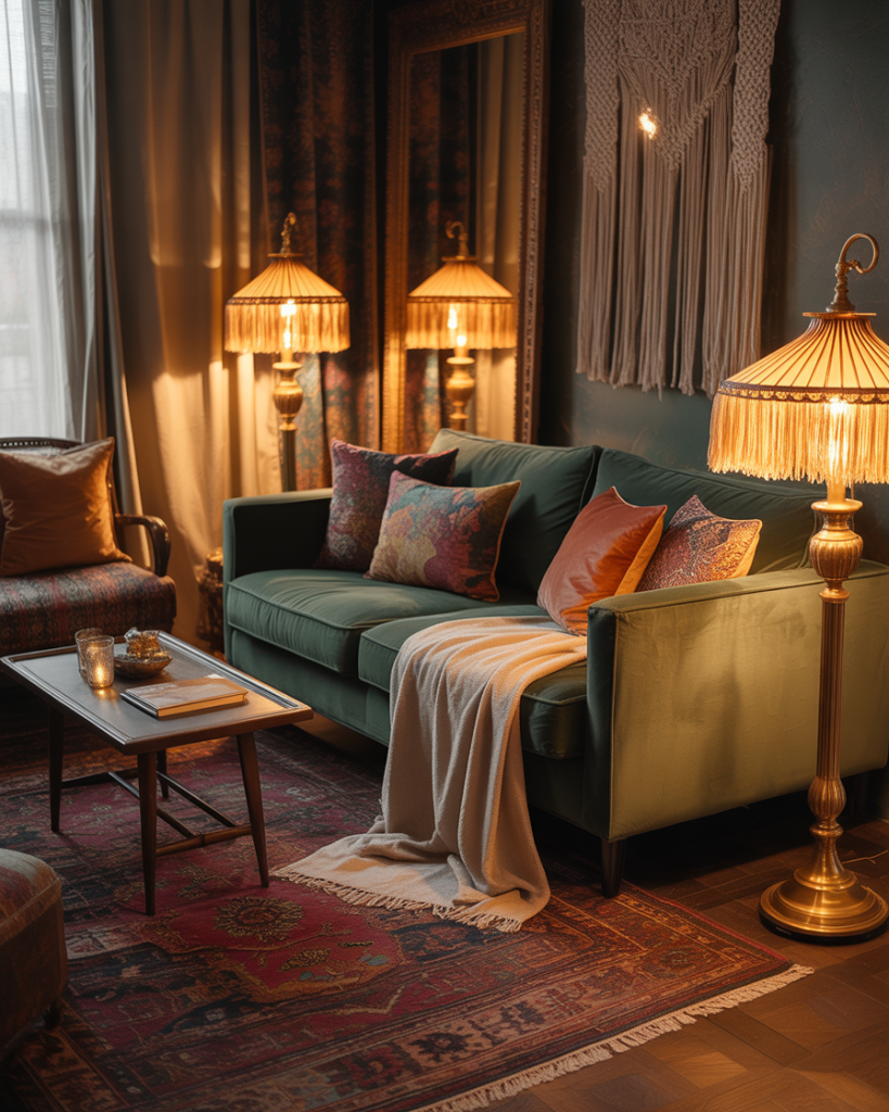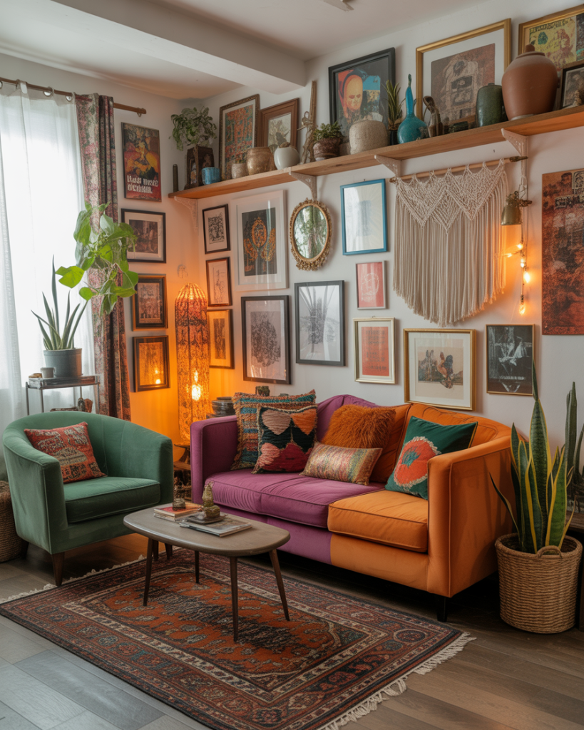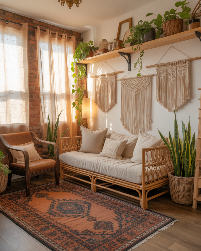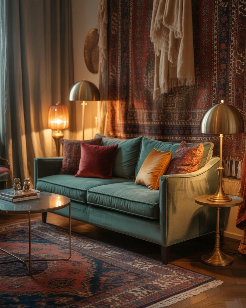 If you love Bohemian warmth but crave luxury, combine the two for a balanced aesthetic. Use vintage rugs, velvet seating, brass accents, and handcrafted pottery for a layered yet elegant look. In a 450 sq ft space, this fusion turns small living into a statement of personality. I once saw a designer’s apartment styled this way—it was bold, sensual, and deeply cozy. In 2026, expressive interiors like this define individuality and comfort.