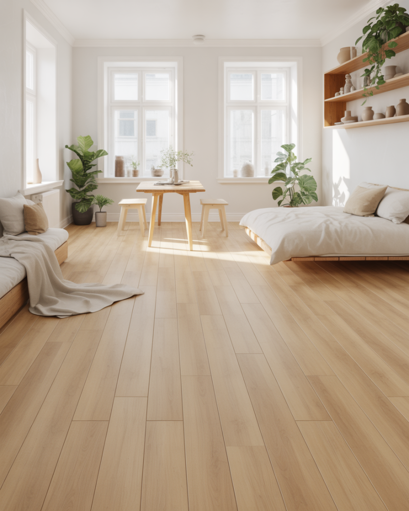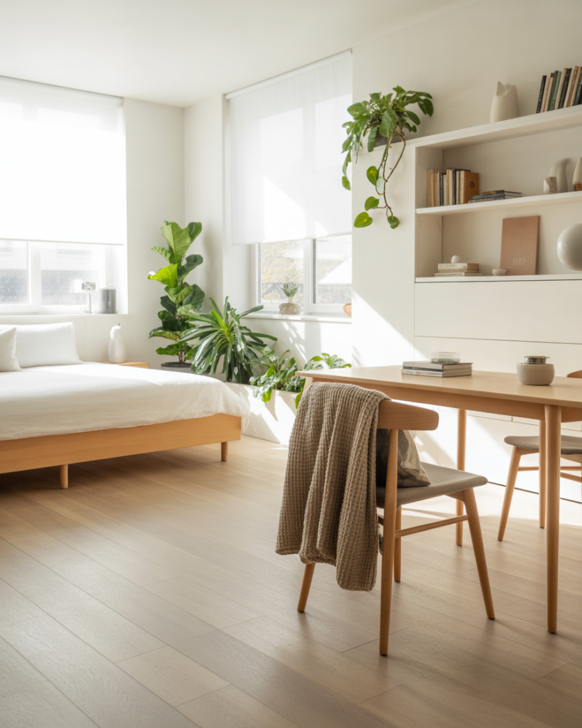 A minimalist Scandinavian-inspired studio focuses on light woods, white walls, and functional comfort. In about 450 sq ft, this style makes a tiny apartment feel large through brightness and texture. A soft rug, woven throws, and plants create a cozy yet modern vibe. Scandinavian design has always valued warmth through simplicity—perfect for 2026, where calm living meets effortless elegance.