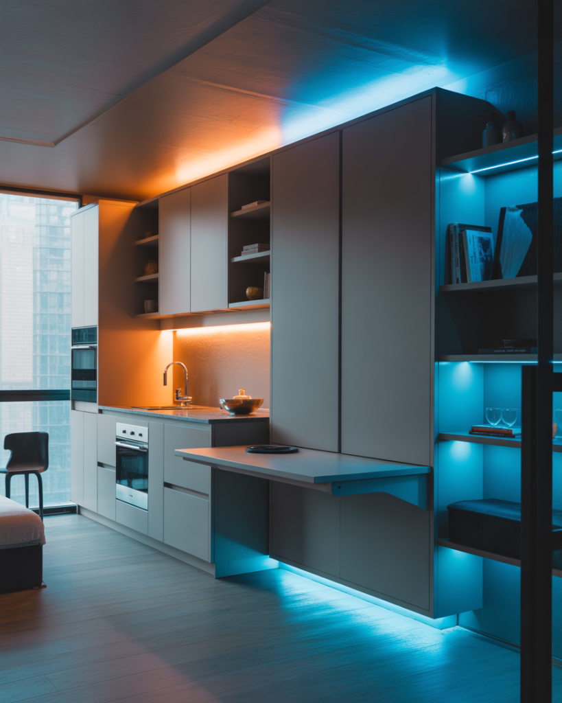 The future of micro apartments is digital. In a 400 sq ft space, smart lighting, hidden speakers, and voice-controlled temperature keep the layout efficient and futuristic. I once stayed in a friend’s smart tiny home where blinds opened at sunrise automatically—it felt like living in tomorrow. Technology in 2026 turns small living into a high-function modern experience without clutter.